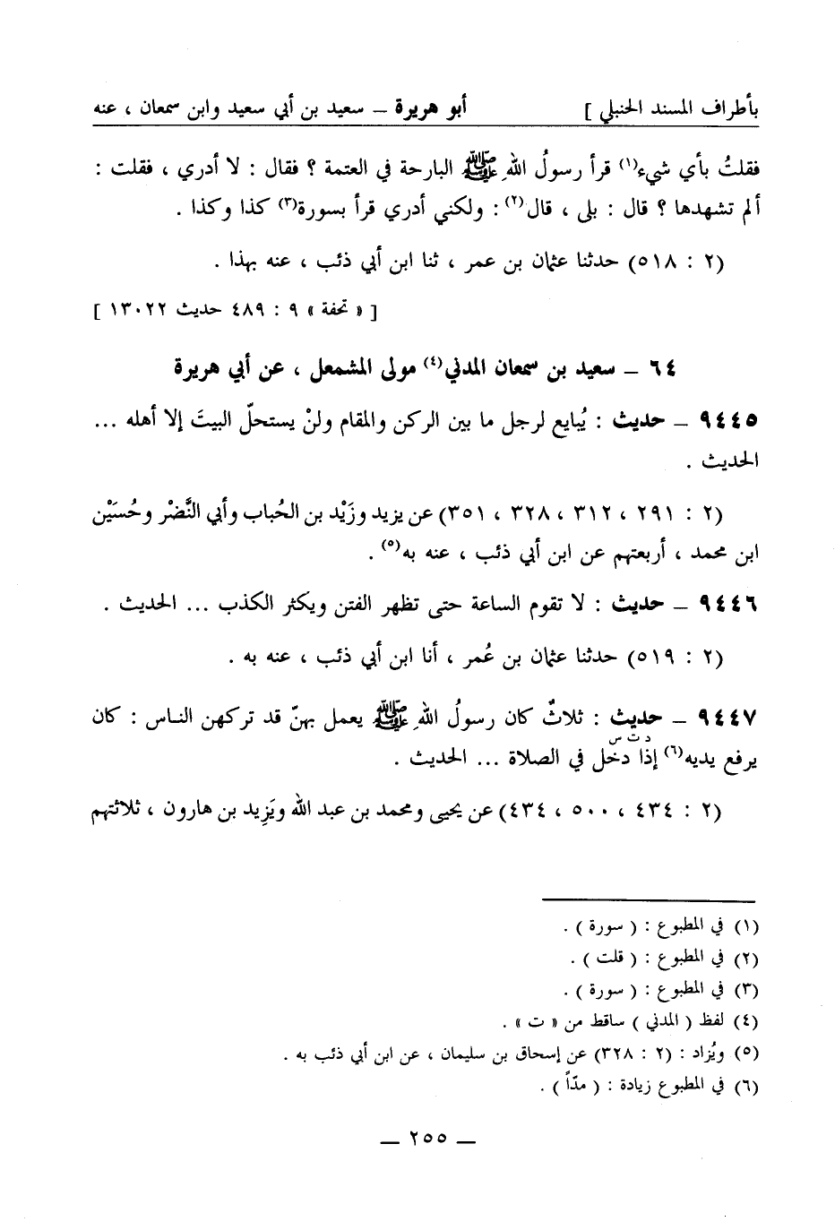 9445 - حديث يُبايع لرجل ما بين الركن والمقام ولن يستحلّ البيت إلا أهله ... الحديث (2: 291، 312، 328، 351) عن يزيد بن الحُبَاب وأبي النَّضْر وحُسَين بن محمد أربعتهم عن ابن أبي ذئب عنه به