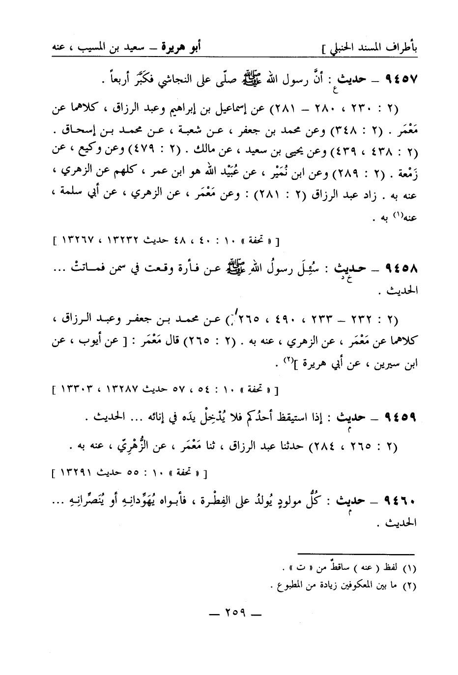 9458 -[خ د] حديث سُئِلَ رسولُ الله صَلَّى اللَّهُ عَلَيْهِ وَسَلَّمَ عن فأرة وقعت في سمن فماتتْ ... الحديث (2: 232 - 233، 490، 265) عن محمد بن جعفر وعبد الرزاق كلاهما عن مَعْمَر عن الزُّهْرِيّ عنه به (2: 265) قال مَعْمَر: [عن أيوب عن ابن سيرين عن أبي هريرة] تحفة 10: 54، 57 حديث 13287، 13303 [