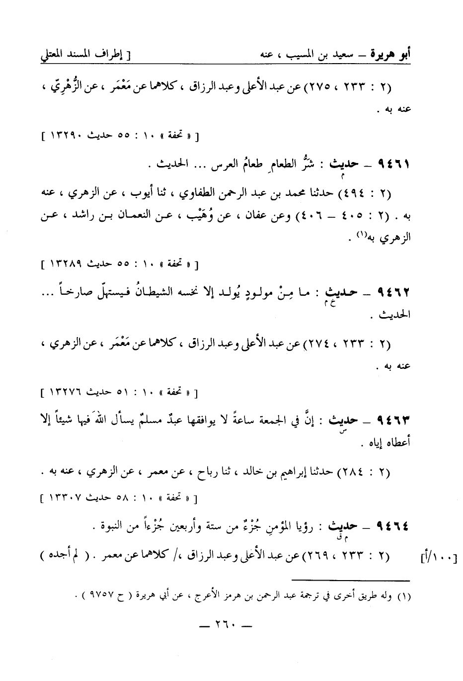9464 -[م ق] حديث رؤيا المؤمنِ جُزْءٌ من ستة وأربعين جُزْءاً من النبوة (2: 233، 269) عن عبد الأعلى وعبد الرزاق كلاهما عن مَعْمَر (لم أجده) -[261]- وعن سفيان بن عُيَينة كلاهما عن الزُّهْرِيّ عنه به