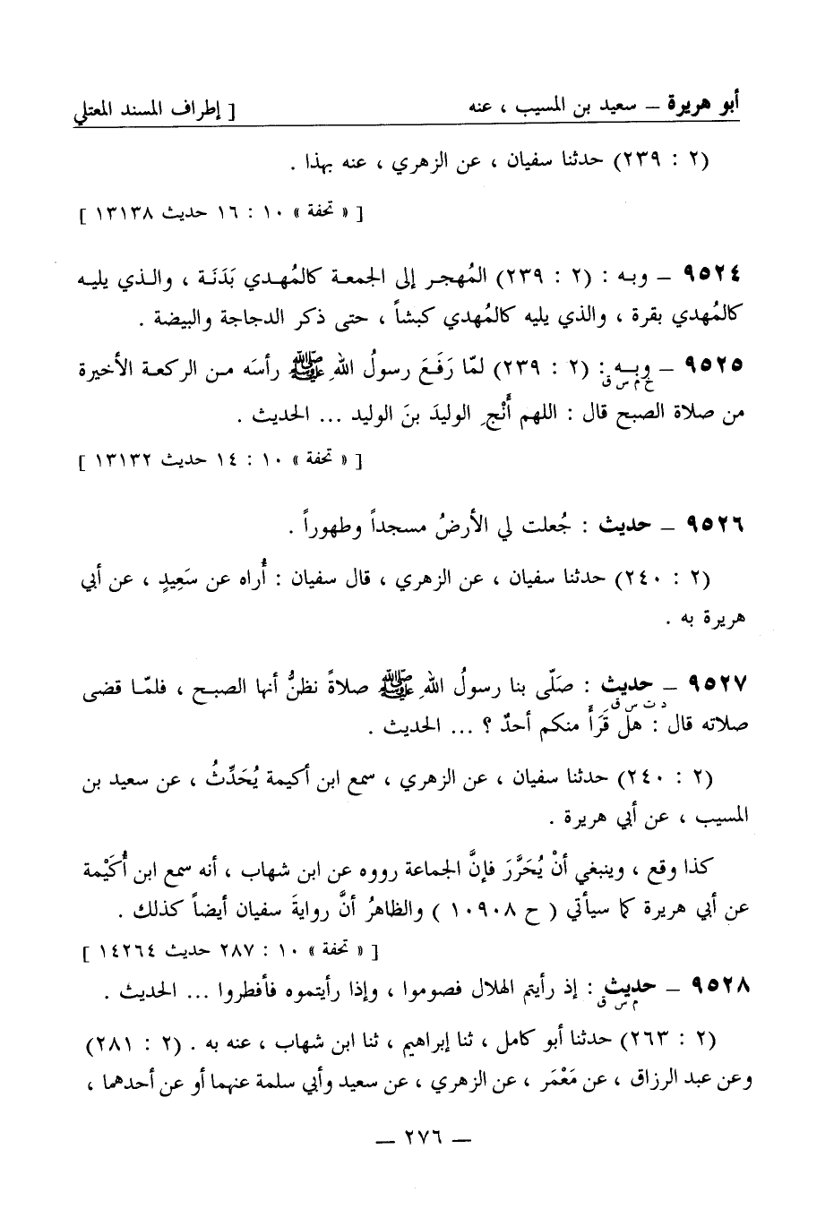 9526 - حديث جُعلت لي الأرض مسجداً وطهوراً (2: 240) حَدَّثَنا سفيان عن الزُّهْرِيّ قال سفيان أُراه عن سعيدٍ عن أبي هريرة به