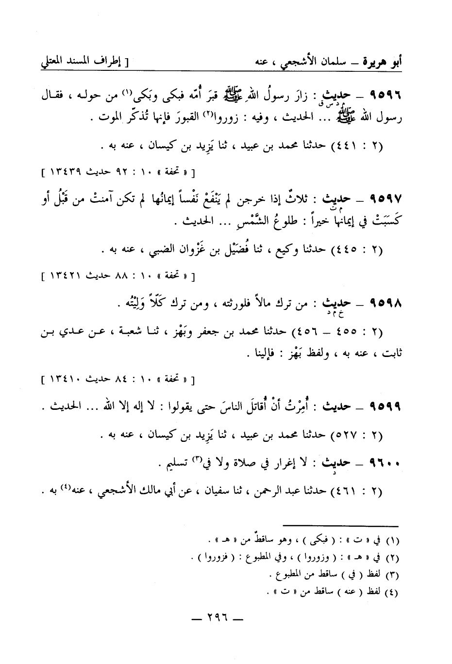 9596 -[م د س ق] حديث زارَ رسولُ الله صَلَّى اللَّهُ عَلَيْهِ وَسَلَّمَ قبرَ أُمّه فبكى وبَكى من حوله فقال رسول الله صَلَّى اللَّهُ عَلَيْهِ وَسَلَّمَ ... الحديث وفيه: زوروا القبور فإنها تُذكّر الموت (2: 441) حَدَّثَنا محمد بن عُبَيد ثنا يزيد بن كيسان عنه به