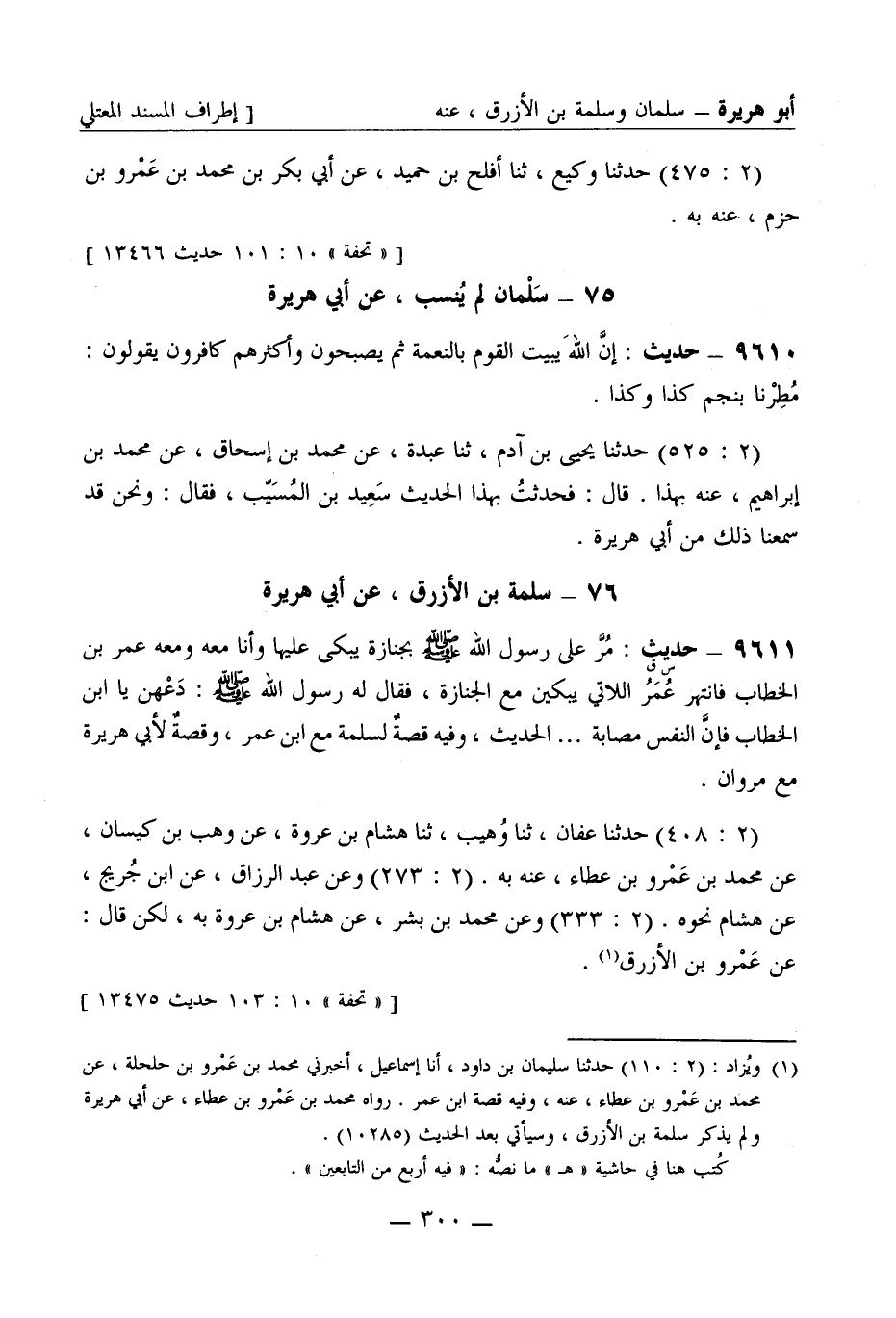 9611 -[س ق] حديث: مُرَّ على رسول الله صَلَّى اللَّهُ عَلَيْهِ وَسَلَّمَ بجنازة يبكي عليها وأنا معه ومعه عمر بن الخطاب فانتهر عمر اللاتي يبكين مع الجنازة فقال له رسول الله صَلَّى اللَّهُ عَلَيْهِ وَسَلَّمَ: دَعْهن يا ابن الخطاب فإنَّ النَّفْس مصابة ... الحديث وفيه قصةٌ لسلمة مع ابن عمر وقصةٌ لأبي هريرة مع مروان (2: 408) حَدَّثنا عفان ثنا وُهَيْب ثنا هشام بن عروة عن وَهْب بن كيسان عن محمد بن عمرو بن عطاء عنه به (2: 273) وعن عبد الرزاق عن ابن جُرَيج عن هشام نحوه (2: 333) وعن محمد بن بِشْر عن هشام بن عروة به لكن قال: عن عمرو بن الأزرق