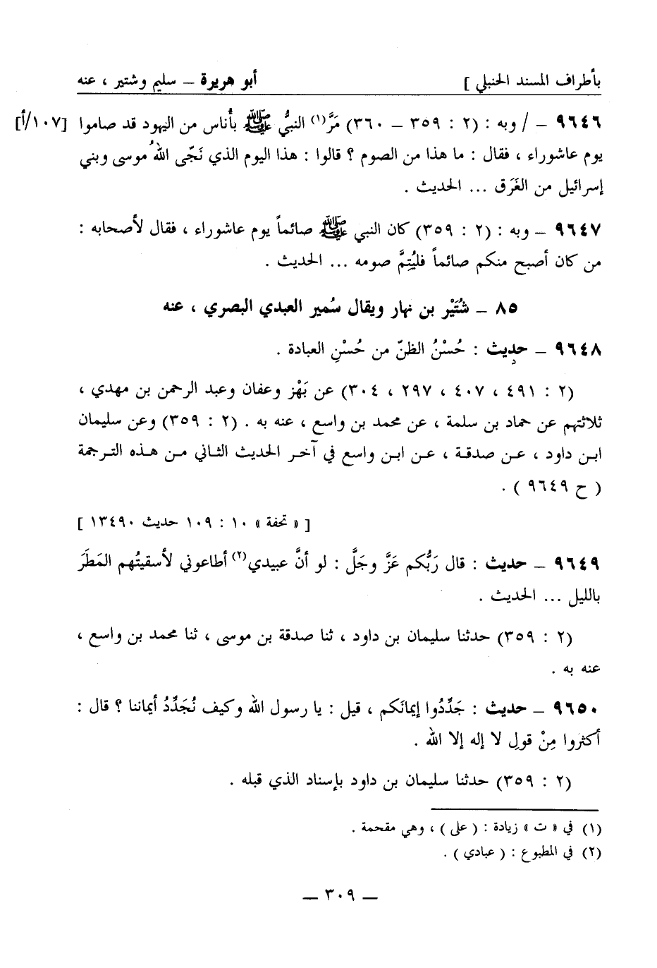 9646 - وبه (2: 359 - 360) مَرَّ النبيُّ صَلَّى اللَّهُ عَلَيْهِ وَسَلَّمَ بأُناس من اليهود قد صاموا يوم عاشوراء، فقال: ما هذا من الصوم؟ قالوا: هذا اليوم الذي نَجّى الله موسى وبني إسرائيل من الغَرَق ... الحديث.