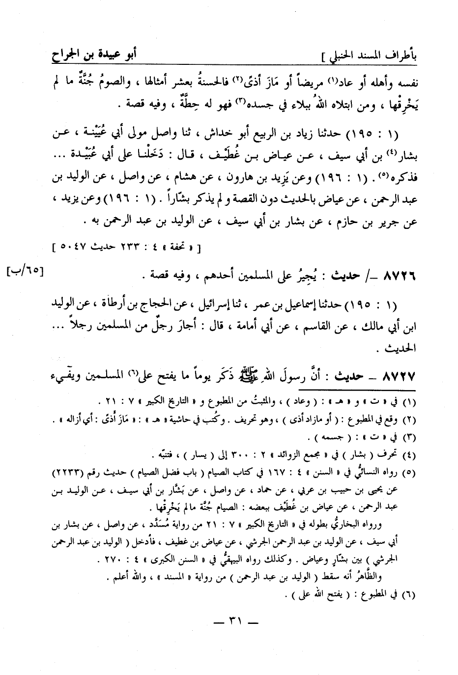 8727 - حديث: أنَّ رسول الله صَلَّى اللَّهُ عَلَيْهِ وَسَلَّمَ ذَكَر يوماً ما يفتح على المسلمين ويفيء -[32]- عليهم حتى ذَكَر الشام فقال: يا أبا عُبَيدة إن يُنْسَأْ في أَجَلِك فحَسْبُك من الخَدَم ثلاثة ... الحديث وفيه قصة. (1: 195 - 196) حَدَّثَنا أبو المغيرة ثنا صفوان بن عمرو حَدَّثَني أبو حِسْبَة مسلم بن أَكْيَس مولى عبد الله بن عامر عن أبي عُبَيدة قال: ذَكَرَ من دَخَلَ عليه فوَجَده يبكي فقال: ما يُبكيك يا أبا عُبَيدة؟ ... فذَكَره.