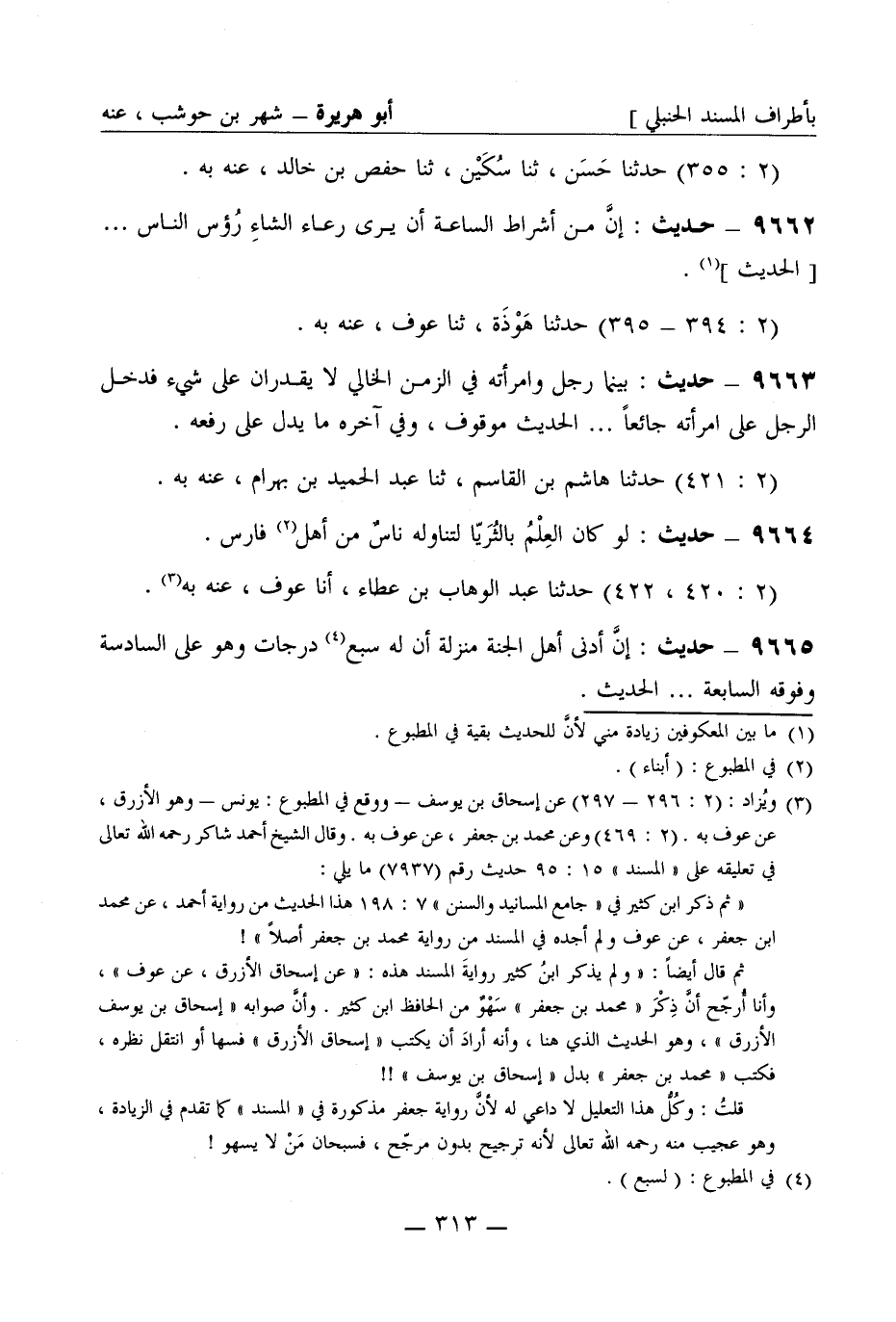 9664 - حديث: لو كان العِلْمُ بالثُرَيّا لتناوله ناسٌ من أهل فارس (2: 420، 422) حَدَّثَنا عبد الوهاب بن عطاء أنا عَوْف عنه به