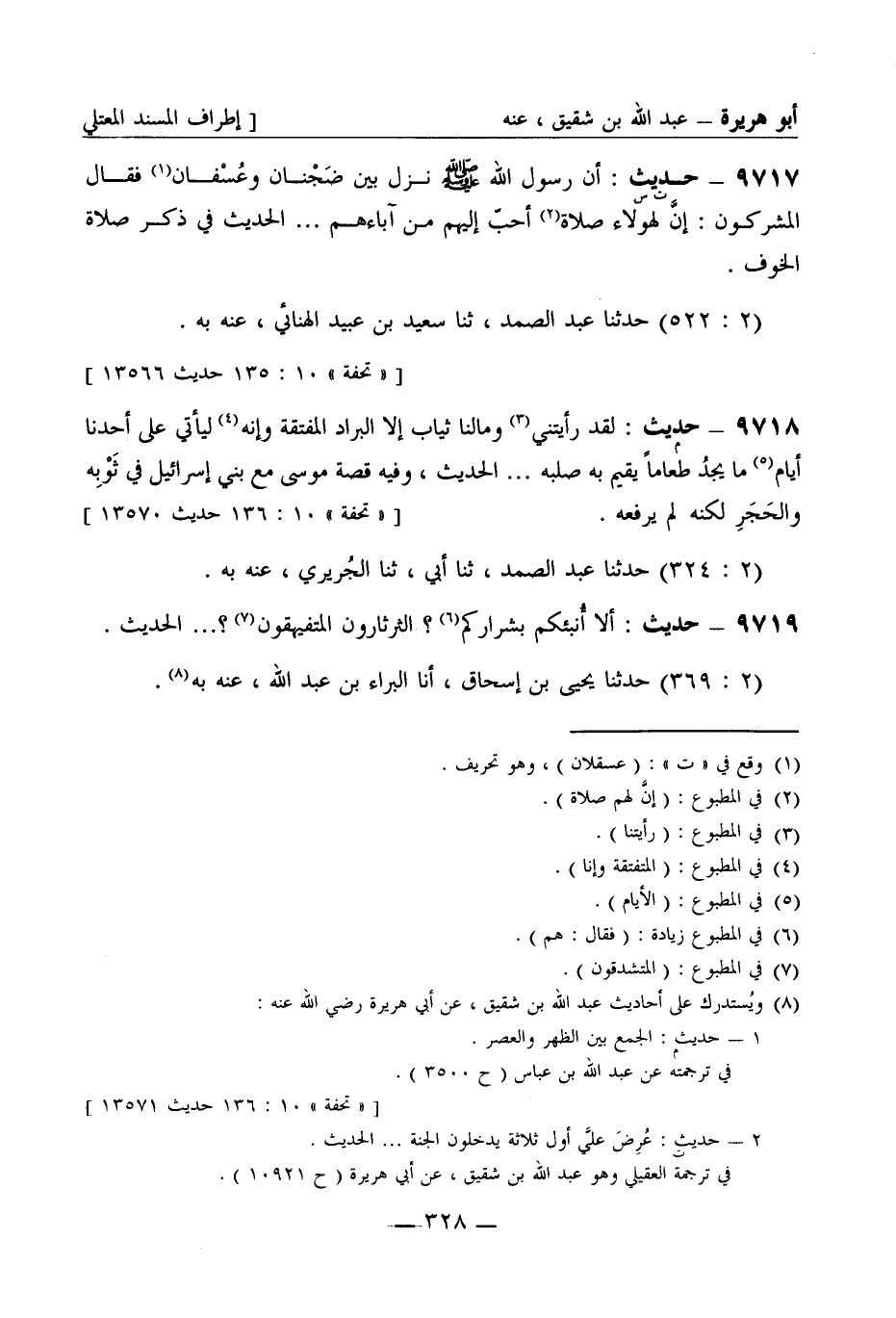 9717 -[ت س] حديث: أنَّ رسول الله صَلَّى اللَّهُ عَلَيْهِ وَسَلَّمَ نزل من ضَجْنان وعُسْفان فقال المشركون: إنَّ لهؤلاء صلاة أَحَبّ إليهم من آبائهم ... الحديث في ذكر صلاة الخوف (2: 522) حَدَّثَنا عبد الصمد ثنا سعيد بن عبيد بن الهانئ عنه به