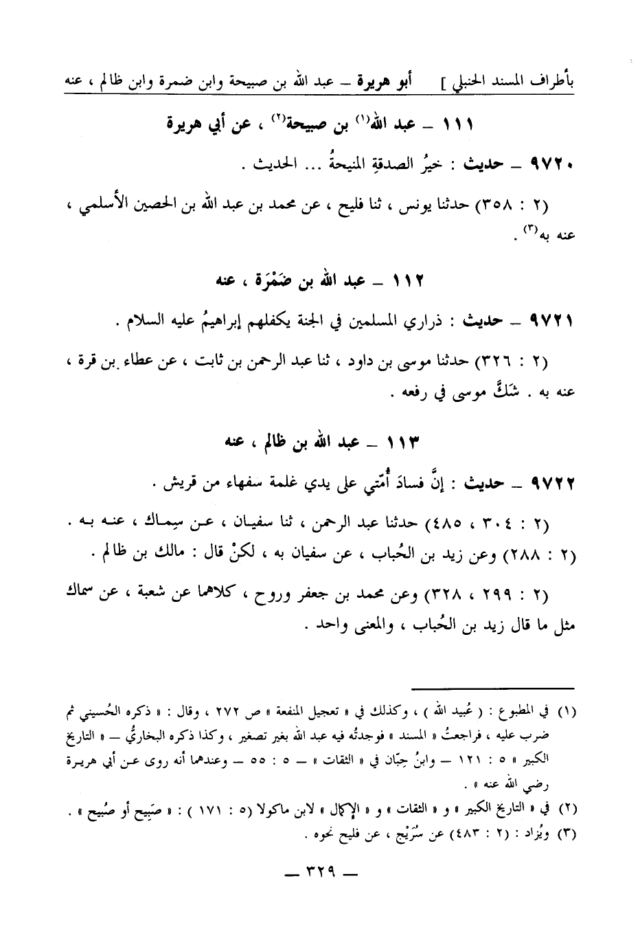 9722 - حديث: إنَّ فسادَ أُمّتي على يدي غلمة سفهاء من قُرَيش (2: 304، 485) حَدَّثَنا عبد الرحمن ثنا سفيان عن سِمَاك عنه به (2: 288) وعن زيد بن الحُبَاب عن سفيان به لكن قال: مالك بن ظالم (2: 299، 328) وعن محمد بن جعفر ورَوْح كلاهما عن شُعبة عن سِمَاك مثل ما قال زيد بن الحُبَاب والمعنى واحد
