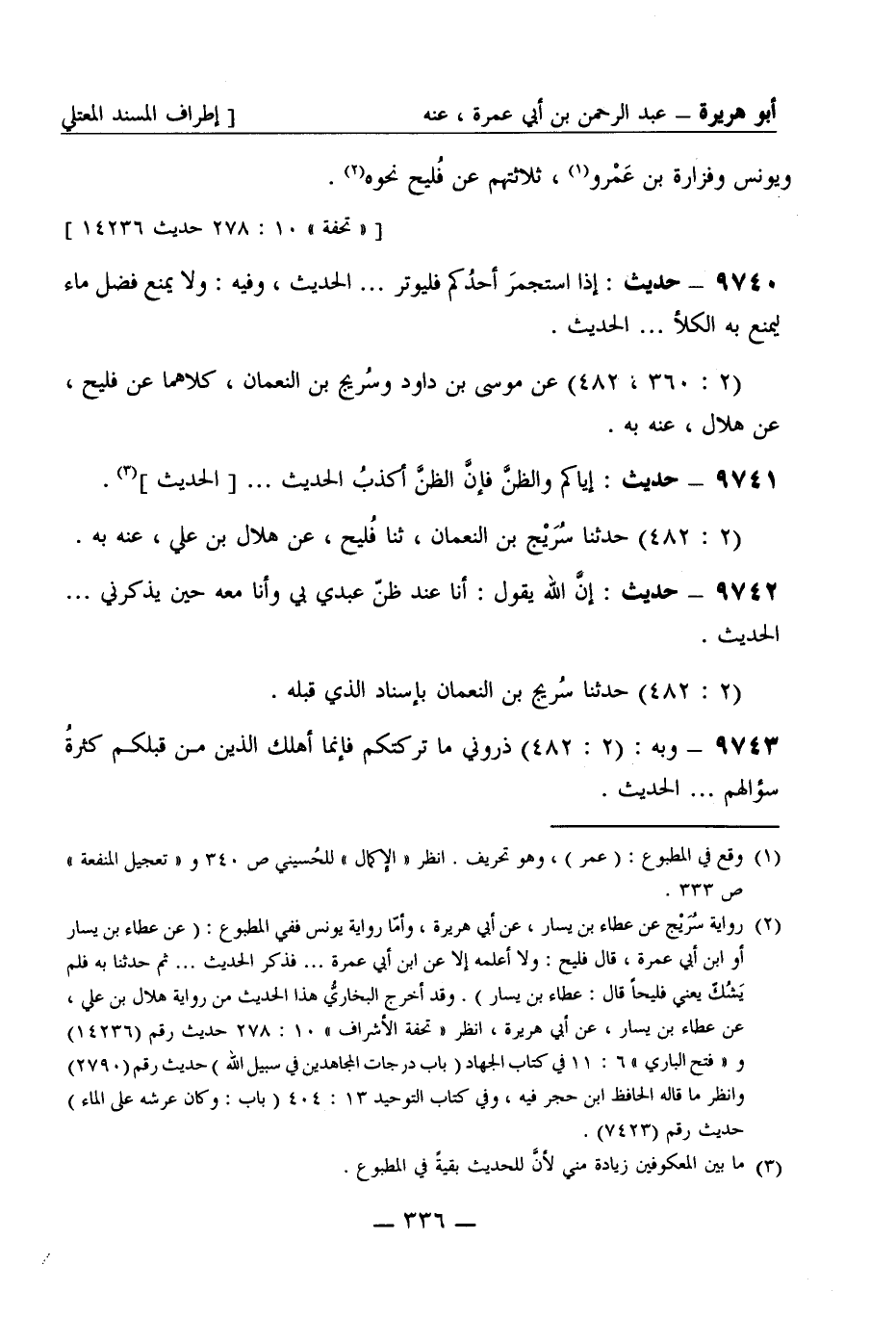 9740 - حديث: إذا استجمرَ أَحَدُكم فليوتر ... الحديث وفيه: ولا يمنع فضل ماء ليمنع به الكلأ ... الحديث (2: 360، 482) عن موسى بن داود وسُرَيج بن النعمان كلاهما عن فُلَيح عن هلال عنه به