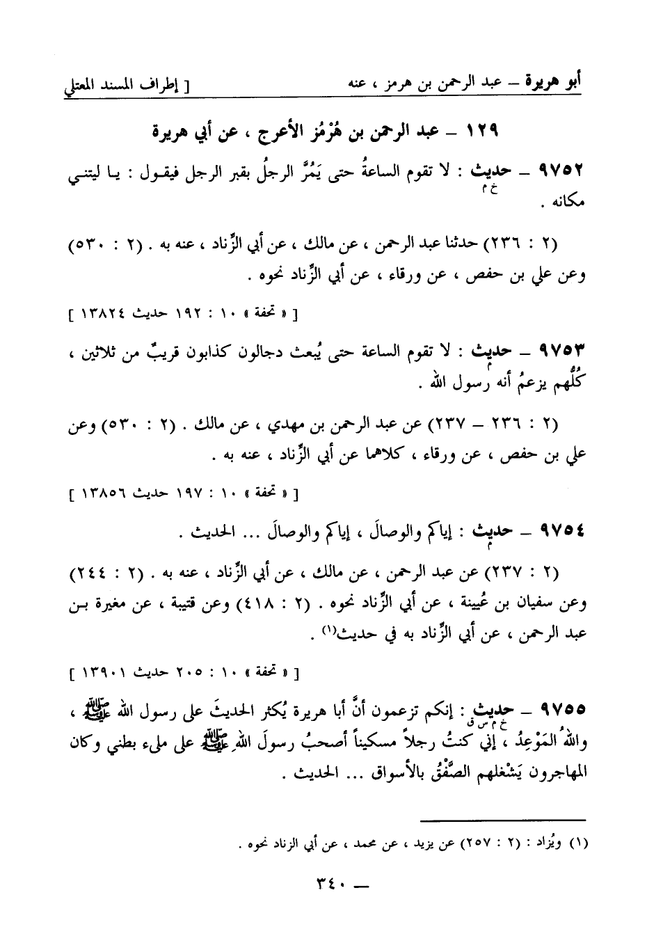 9752 -[خ م] حديث: لا تقوم الساعةُ حتى يَمُرَّ الرجلُ بقبر الرجل فيقول: يا ليتني مكانه (2: 236) حَدَّثَنا عبد الرحمن عن مالك عن أبي الزِّناد عنه به (2: 530) وعن علي بن حفص عن ورقاء عن أبي الزِّناد نحوه