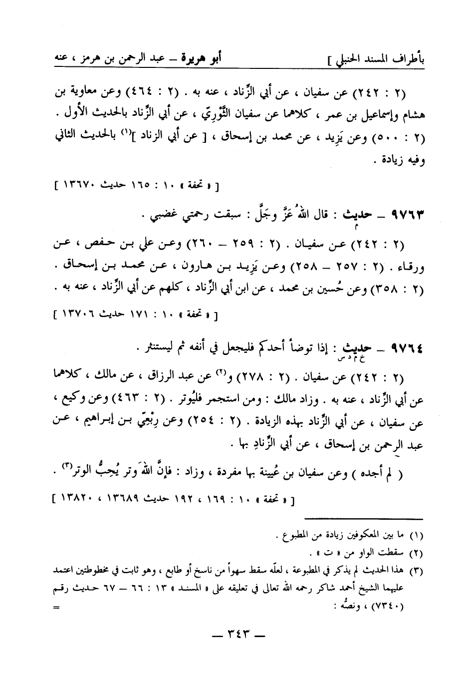 9763 -[م] حديث: قال الله عَزَّ وجَلَّ: سبقت رحمتي غضبي (2: 242) عن سفيان (2: 259 - 260) وعن علي بن حفص عن ورقاء (2: 257 - 258) وعن يزيد بن هارون عن محمد بن إسحاق (2: 358) وعن حُسَين بن محمد عن ابن أبي الزِّناد كُلّهم عن أبي الزِّناد عنه به