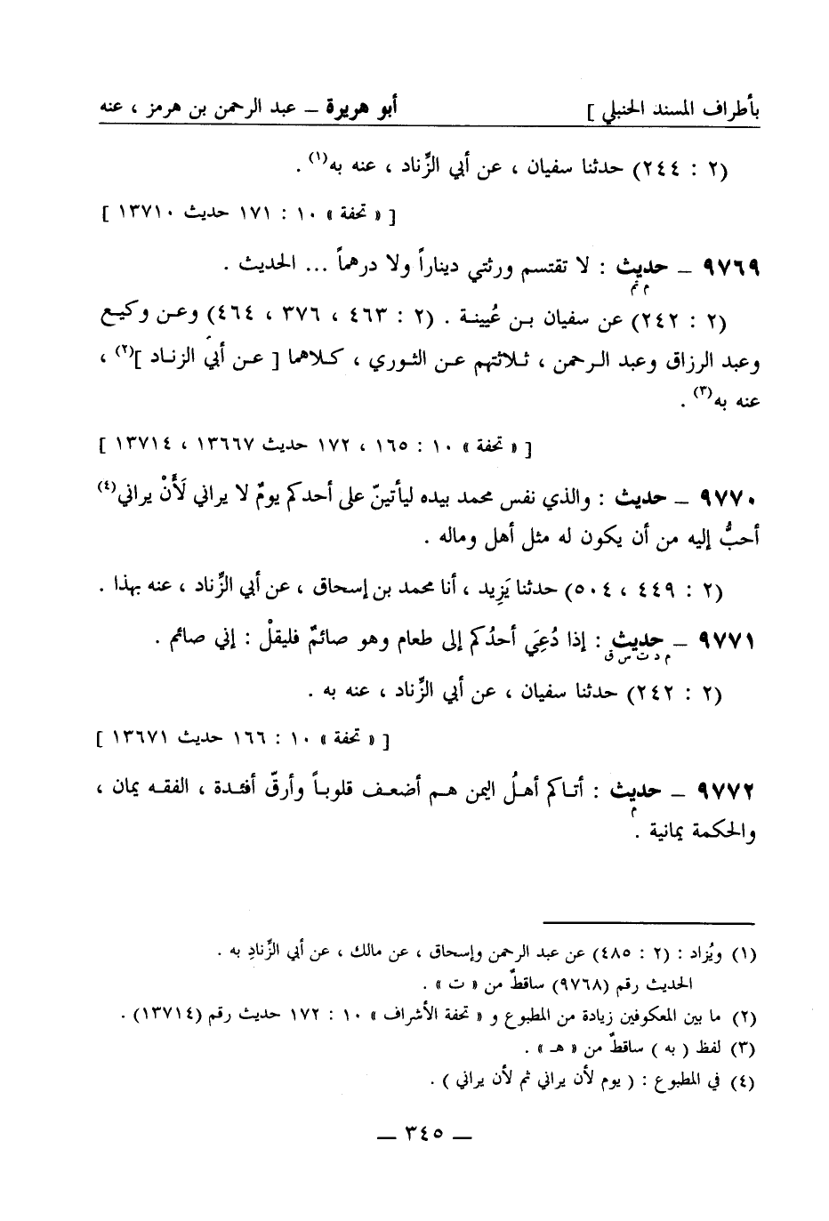 9769 -[م تم] حديث: لا تقتسم ورثتي ديناراً ولا درهماً ... الحديث (2: 242) عن سفيان بن عُيينة (2: 463، 376، 464) وعن وكيع وعبد الرزاق وعبد الرحمن ثلاثتهم عن الثَّوْرِيّ كلاهما [عن أبي الزِّناد] عنه به
