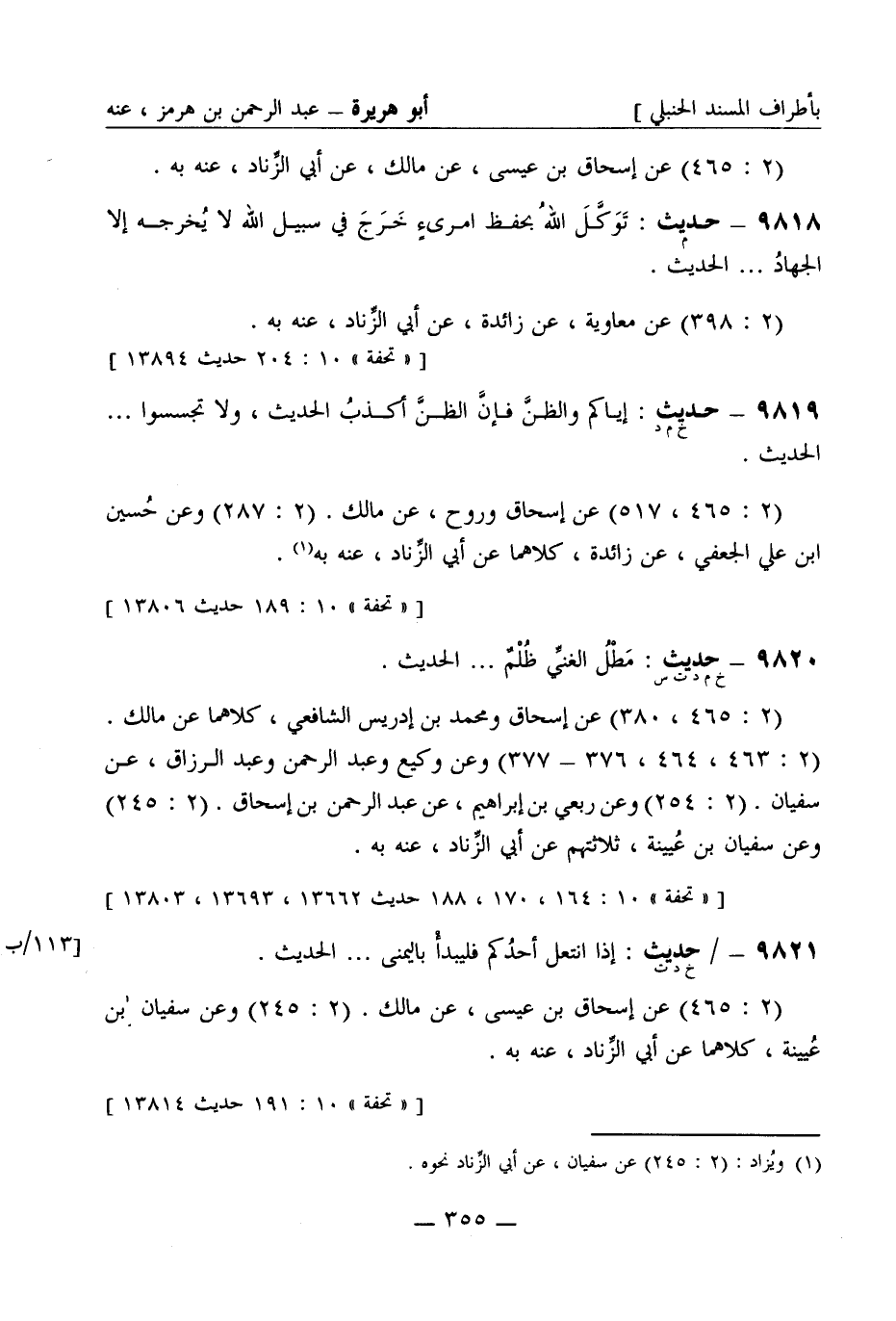 9819 -[خ م د] حديث: إياكم والظنّ فإنَّ الظنَّ أكذبُ الحديث ولا تجسسوا ... الحديث (2: 465، 517) عن إسحاق ورَوْح عن مالك (2: 287) وعن حُسَين بن علي الجعفي عن زائدة كلاهما عن أبي الزِّناد عنه به