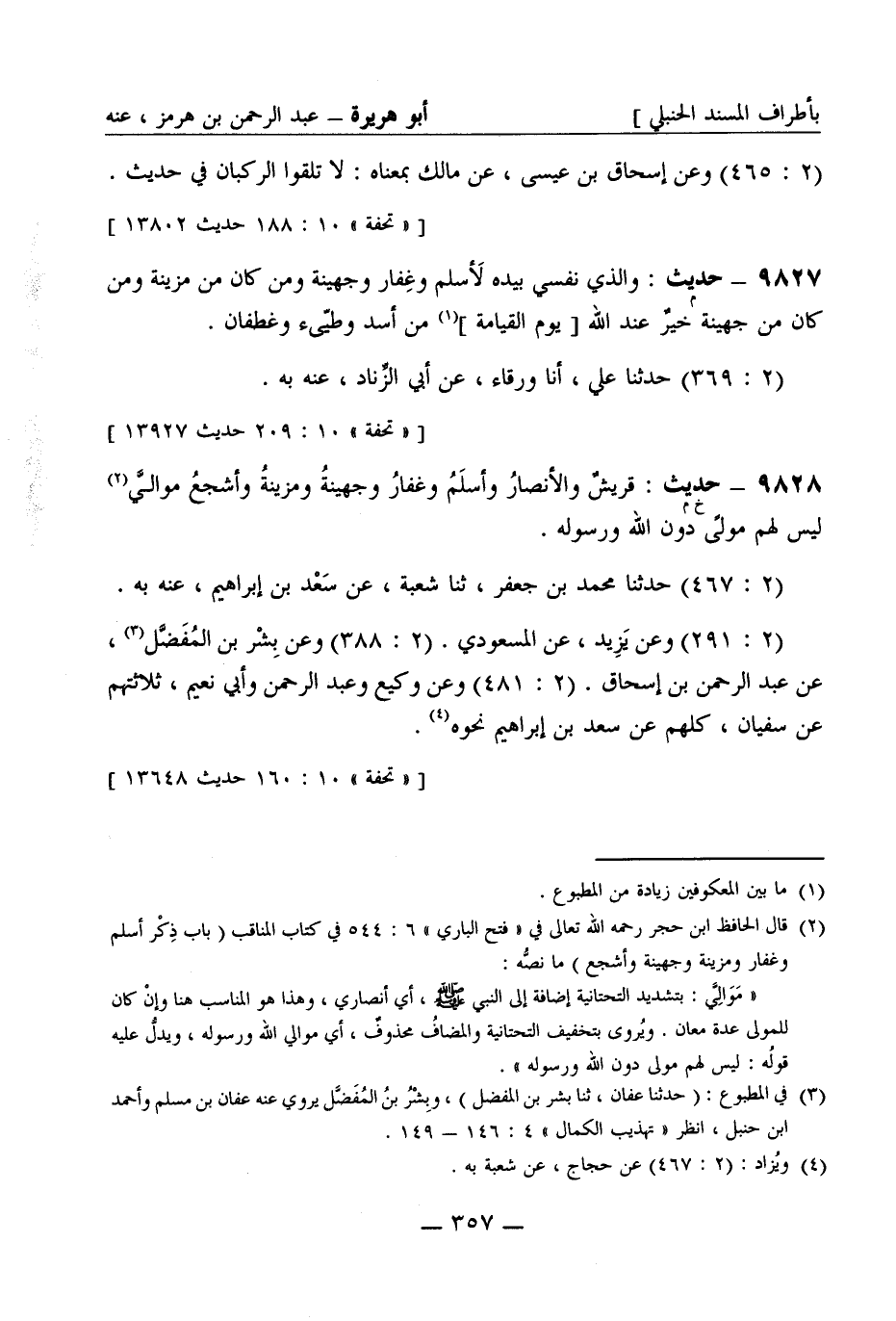 9828 -[خ م] حديث: قُرَيشٌ والأنصارُ وأَسْلَمُ وغِفارُ وجهينةُ ومزينةُ وأشجعُ مواليَّ ليس لهم مولى دون الله ورسوله (2: 467) حَدَّثَنا محمد بن جعفر ثنا شُعبة عن سعد بن إبراهيم عنه به (2: 291) وعن يزيد عن المسعودي (2: 388) وعن بِشْر بن المُفَضَّل عن عبد الرحمن بن إسحاق (2: 481) وعن وكيع وعبد الرحمن وأبي نعيم ثلاثتهم عن سفيان كُلّهم عن سعد بن إبراهيم نحوه