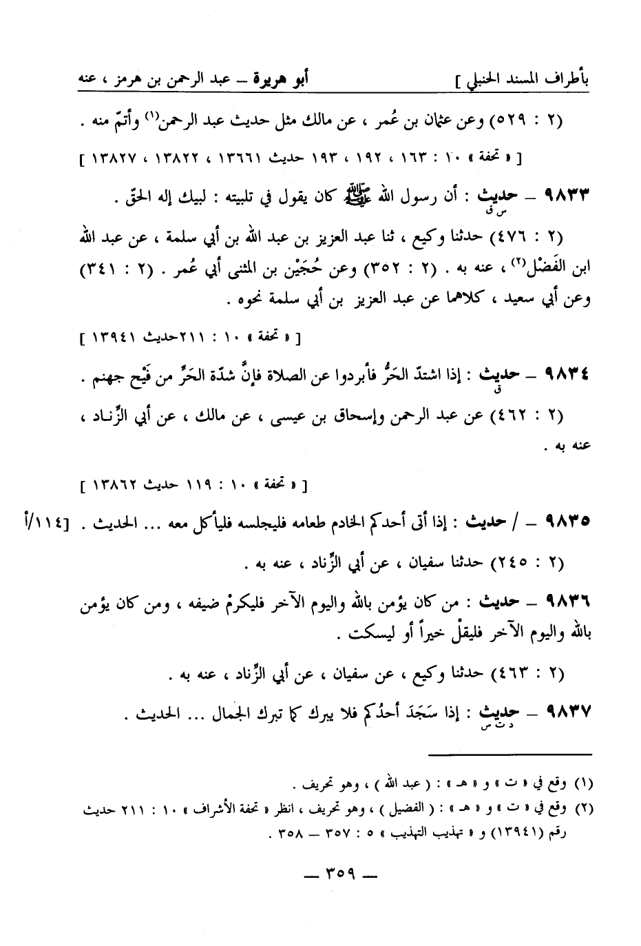 9833 -[س ق] حديث أنَّ رسول الله صَلَّى اللَّهُ عَلَيْهِ وَسَلَّمَ كان يقول في تلبيته: لَبَّيْك إله الحقّ (2: 476) حَدَّثَنا وكيع ثنا عبد العزيز بن عبد الله بن أبي سلمة عن عبد الله بن الفَضْل عنه به (2: 352) وعن حُجَين بن المثنى أبي عمر (2: 341) وعن أبي سعيد كلاهما عن عبد العزيز بن أبي سلمة نحوه