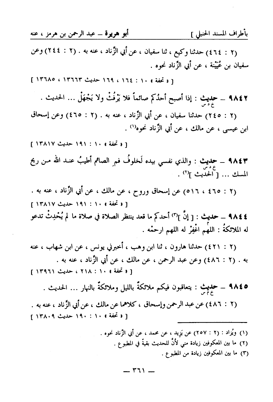 9842 -[خ د س] حديث: إذا أصبح أَحَدُكم صائماً فلا يَرْفُثْ ولا يَجْهَلْ ... الحديث (2: 245) حَدَّثَنا سفيان عن أبي الزِّناد عنه به (2: 465) وعن إسحاق بن عيسى عن مالك عن أبي الزِّناد نحوه