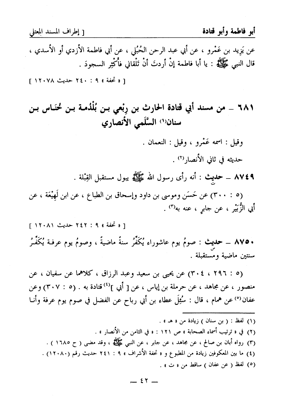 8750 -[س] حديث يوم عاشوراء يُكَفِّرُ سنةً ماضية وصومُ يوم عرفة يُكَفِّرُ سنتين ماضية ومستقبلة. (5: 296، 304) عن يحيى بن سعيد وعبد الرزاق كلاهما عن سفيان عن منصور عن مجاهد عن حرملة بن إياس عن [أبي] قَتَادة به (5: 307) وعن عفان عن هَمَّام قال: سُئِلَ عطاء بن أبي رَبَاح عن الفضل في صوم يوم عرفة وأنا -[43]- شاهد فقال: جاء هذا من قِبَلكم يا أهل العراق حَدَّثَنيه أبو الخليل عن حرملة بن إياس عن [أبي] قَتَادة به (5: 296) حَدَّثَنا سفيان سَمِعناه من داود بن شابور عن أبي قَزَعة عن أبي الخليل عن أبي حرملة عن أبي قَتَادة به قال أحمد: لم يرفعه لنا سفيان وهو مرفوع. (5: 296) قال عبد الله: حَدَّثَنا به نَصْرُ بن علي ثنا سفيان فرفعه. (5: 295) وعن هُشَيم عن منصور عن قَتَادة عن عبد الله بن مَعْبَد الزِّمَّاني عن أبي قَتَادة به. (5: 308) وعن عفان عن مهدي بن ميمون عن غَيْلان بن جَرِير عن عبد الله بن مَعْبَدٍ به. وله طريق تأتي في أواخر الترجمة (ح8791) .