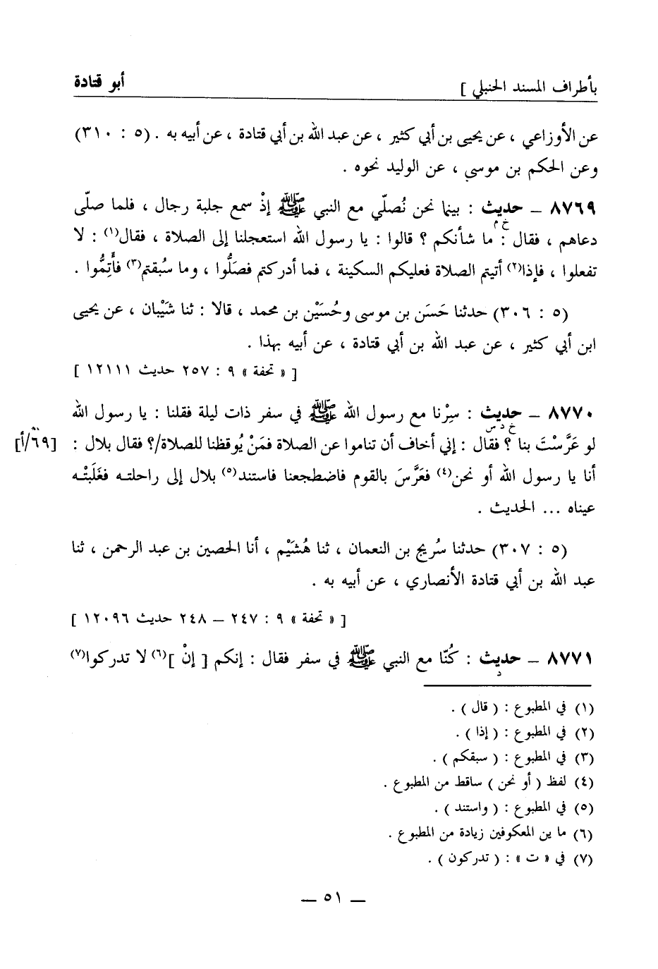 8771 -[د] حديث كُنّا مع النبيّ صَلَّى اللَّهُ عَلَيْهِ وَسَلَّمَ في سَفَر فقال: إنكم [إن] لا تدركوا -[52]- الماء غداً تعطشوا فانطلق سرعان الناس يُريدون الماء ولزمتُ رسول الله صَلَّى اللَّهُ عَلَيْهِ وَسَلَّمَ فمالت برسول الله صَلَّى اللَّهُ عَلَيْهِ وَسَلَّمَ راحلتُه فنعس فدعمتُه فادّعم ... الحديث بطوله (5: 298) حَدَّثَنا يزيد بن هارون ثنا حمّاد بن سَلَمة عن ثابت عن عبد الله بن رَبَاح عنه به قال عبد الله بن رَبَاح: فسمعني عمران بن حُصَين وأنا أُحَدِّثُ بهذا الحديث في المسجد الجامع فقال: من الرجل؟ فقُلت: أنا عبد الله بن رَبَاح الأنصاري قال: القوم أعلم بحديثهم انْظُر كيف تُحَدِّثُ فإني أَحَد السبعة تلك الليلة فلمّا فرغت قال: ما كنتُ أحسبُ أَحَداً يحفظ هذا الحديث غيري (5: 298) قال حمّاد: وحَدَّثَنا حُمَيد الطويل عن بكر بن عبد الله المُزَنِيّ عن عبد الله بن رَبَاح بمثله وزيادة (5: 302) وعن محمد بن جعفر عن سعيد عن قَتَادة عن عبد الله بن رَبَاح بطوله وليس فيه حديث عمران بن حُصَين (5: 298) قال عبد الله: حَدَّثَنا إبراهيم بن الحجاج عن حمّاد عن ثابت (5: 298 - 299) وعن حُمَيد بالإسنادين نحوه
