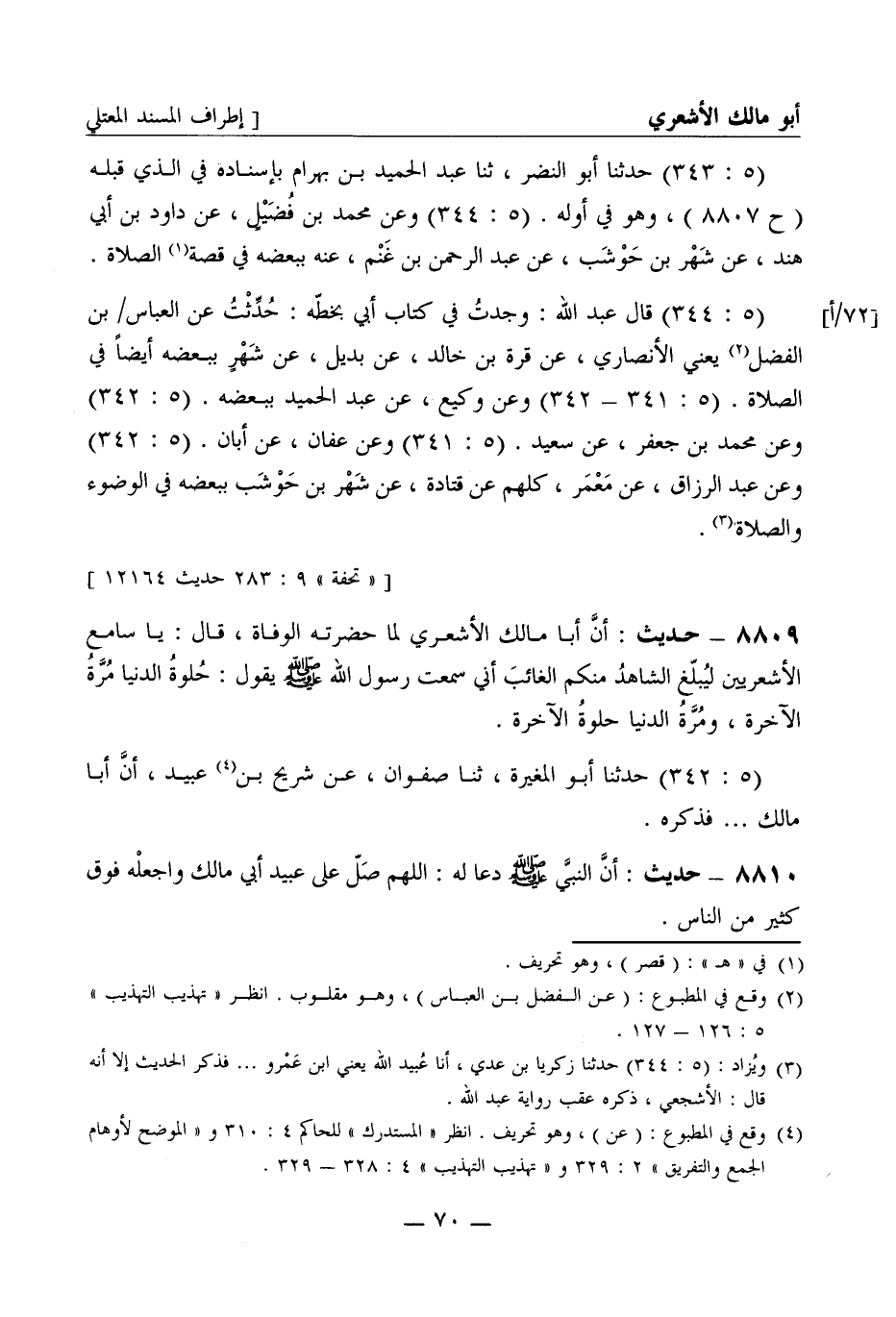8810 - حديث: أنَّ النبيَّ صَلَّى اللَّهُ عَلَيْهِ وَسَلَّمَ دعا له: اللهمَّ صَلّ على عبيد أبي مالك واجعلْه فوق كثير من الناس -[71]-. (5: 343) حَدَّثَنا الحَسَن بن موسى أنا حَرِيز عن حبيب بن عُبَيد عن أبي مالك بهذا.