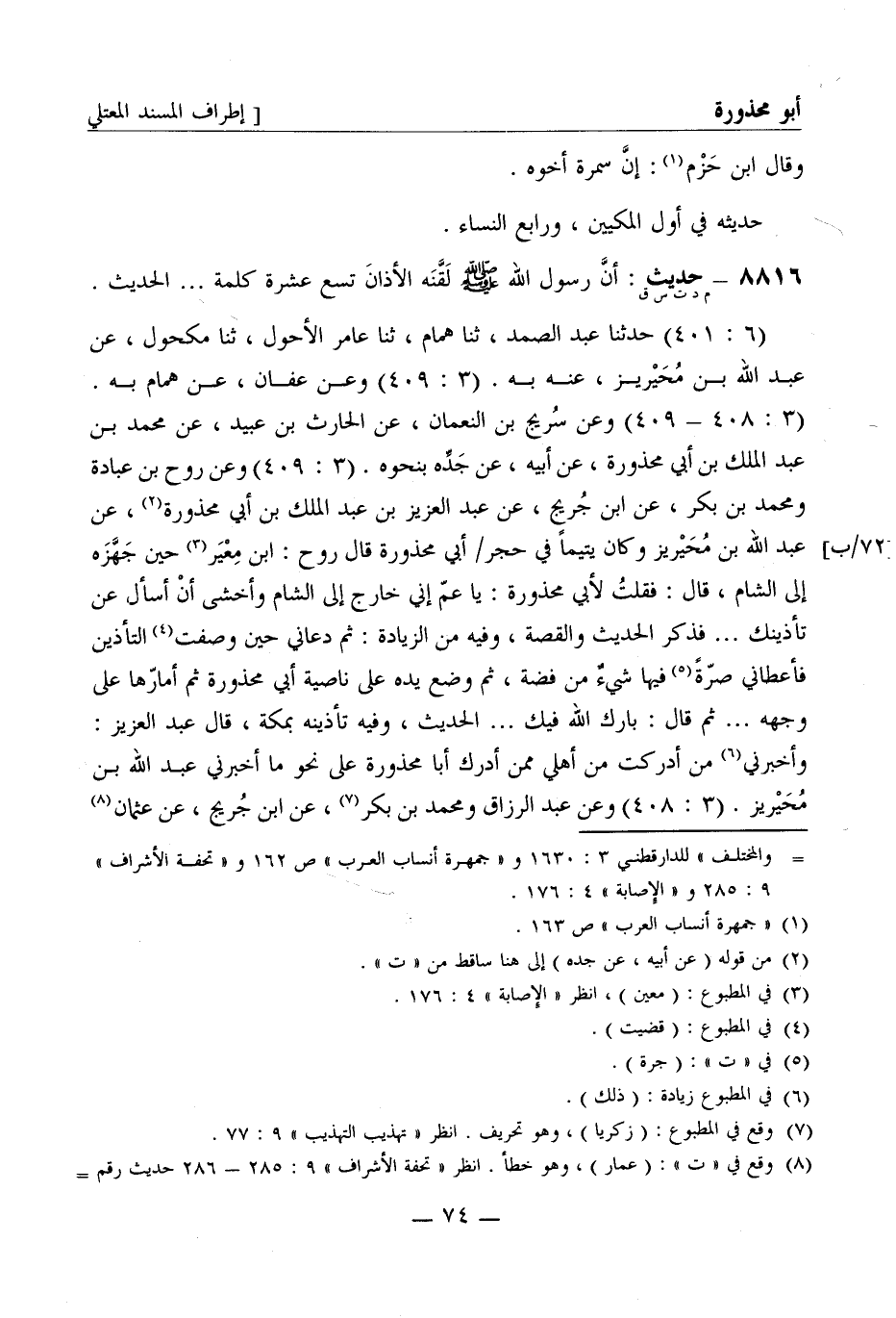 8816 -[م د ت س ق] حديث: أنَّ رسول الله صَلَّى اللَّهُ عَلَيْهِ وَسَلَّمَ لَقَّنَه الأذان تسع عشرة كلمة ... الحديث (6: 401) حَدَّثَنا عبد الصمد ثنا هَمَّام ثنا عامر الأحول ثنا مكحول عن عبد الله بن مُحَيْرِيز عنه به (3: 409) وعن عفان عن هَمَّام به (3: 408 - 409) وعن سُرَيج بن النعمان عن الحارث بن عبيد عن محمد بن عبد الملك بن أبي محذورة عن أبيه عن جَدِّه بنحوه (3: 409) وعن رَوْح بن عُبادة ومحمد بن بكر عن ابن جُرَيج عن عبد العزيز بن عبد الملك بن أبي محذورة عن عبد الله بن مُحَيْرِيز وكان يتيما في حجرأبي محذورة قال رَوْح: ابن مِعْيَر حين جَهَّزَه إلى الشام قال: فقُلت لأبي محذورة: يا عمّ إني خارج إلى الشام وأخشى أن أسأل عن تأذينك ... فذَكَر الحديث والقصة وفيه من الزيادة: ثم دعاني حين وصفت التأذين فأعطاني صرّة فيها شيءٌ من فضة ثم وضع يده على ناصية أبي محذورة ثم أمارّها على وجهه ... ثم قال: بارك الله فيك ... الحديث وفيه تأذينة بمكة قال عبد العزيز: وأخبرني من أدركت من أهلي ممن أدرك أبا محذورة على نحو ما أخبرني عبد الله بن مُحَيْرِيز (3: 408) وعن عبد الرزاق ومحمد بن بكر عن ابن جُرَيج عن عثمان -[75]- بن السَّائب قال عبد الرزاق: عن أبيه السَّائب مولى أبي محذورة وأُمّ عبد الملك بن أبي محذورة أنهما سَمِعَاه من أبي محذورة ... فذَكَر الحديث والقصة دون ما في آخره وقال ابن بكر: عن أُمّ عبد الملك به