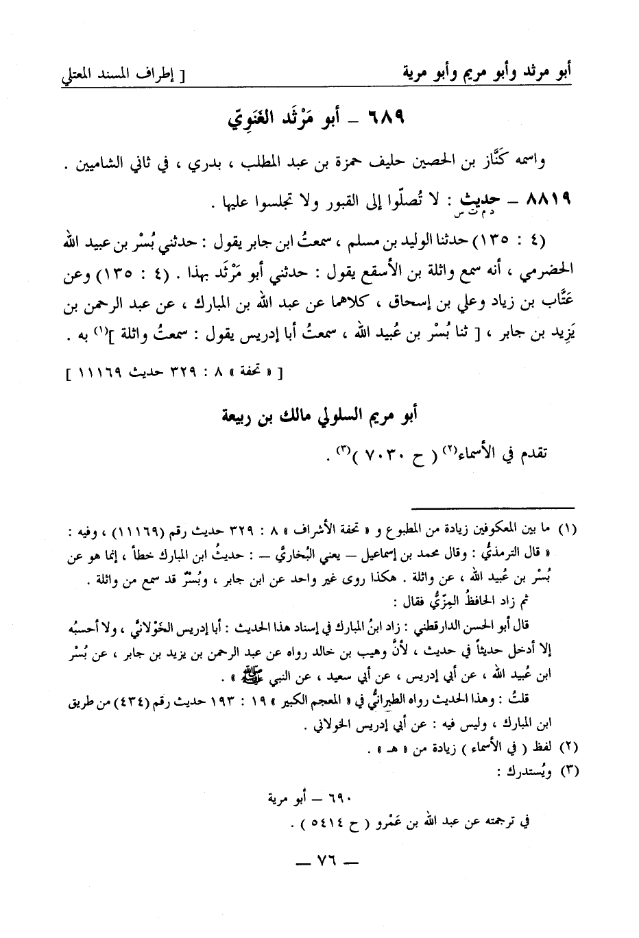 8819 - (د م ت س) حديث: لا تُصلّوا إلى القبور ولا تجلسوا عليها (4: 135) حَدَّثَنا الوليد بن مسلم سَمِعتُ ابن جابر يقول: حَدَّثَني بُسْر بن عُبَيد الله الحضرمي أنه سَمِعَ واثلة بن الأسقع يقول: حَدَّثَني أبو مَرْثَد بهذا (4: 135) وعن عَتَّاب بن زياد وعلي بن إسحاق كلاهما عن عبد الله بن المبارك عن عبد الرحمن بن يزيد بن جابر [ثنا بُسْر بن عُبَيد الله سَمِعتُ أبا إدريس يقول: سَمِعتُ واثلة] به