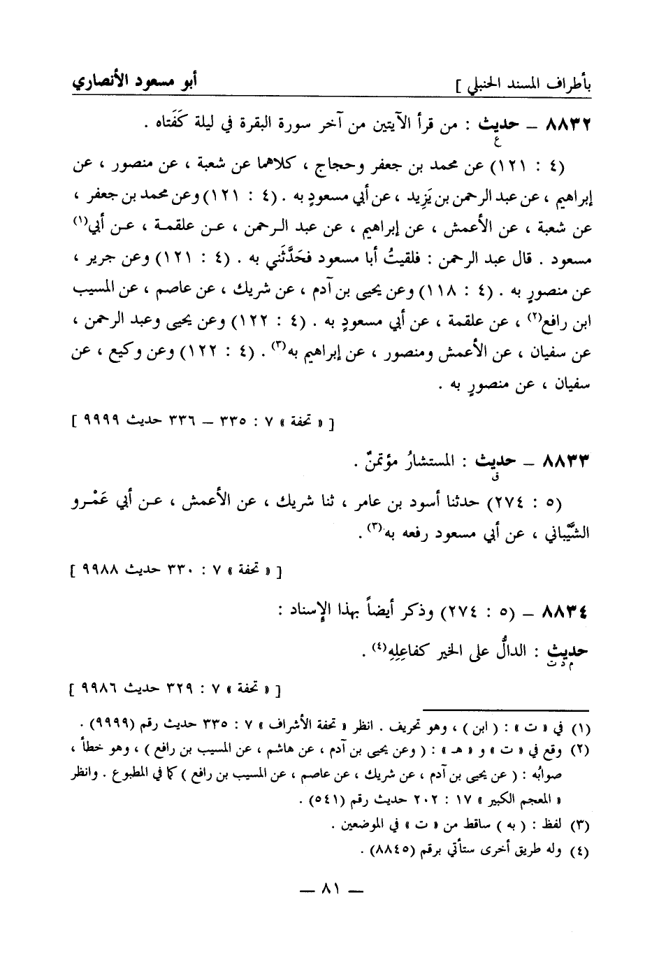 8832 -[ع] حديث: من قرأ الآيتين من آخر سورة البقرة في ليلة كَفَتاه (4: 121) عن محمد بن جعفر وحجاج كلاهما عن شُعبة عن منصور عن إبراهيم عن عبد الرحمن بن يزيد عن أبي مسعودٍ به (4: 121) وعن محمد بن جعفر عن شُعبة عن الأعمش عن إبراهيم عن عبد الرحمن عن علقمة عن أبي مسعود قال عبد الرحمن: فلقيتُ أبا مسعود فحَدَّثَني به (4: 121) وعن جَرِير عن منصورٍ به (4: 118) وعن يحيى بن آدم عن شريك عن عاصم عن المسيب بن رافع عن علقمة عن أبي مسعودٍ به (4: 122) وعن يحيى وعبد الرحمن عن سفيان عن الأعمش ومنصور عن إبراهيم به (4: 122) وعن وكيع عن سفيان عن منصورٍ به
