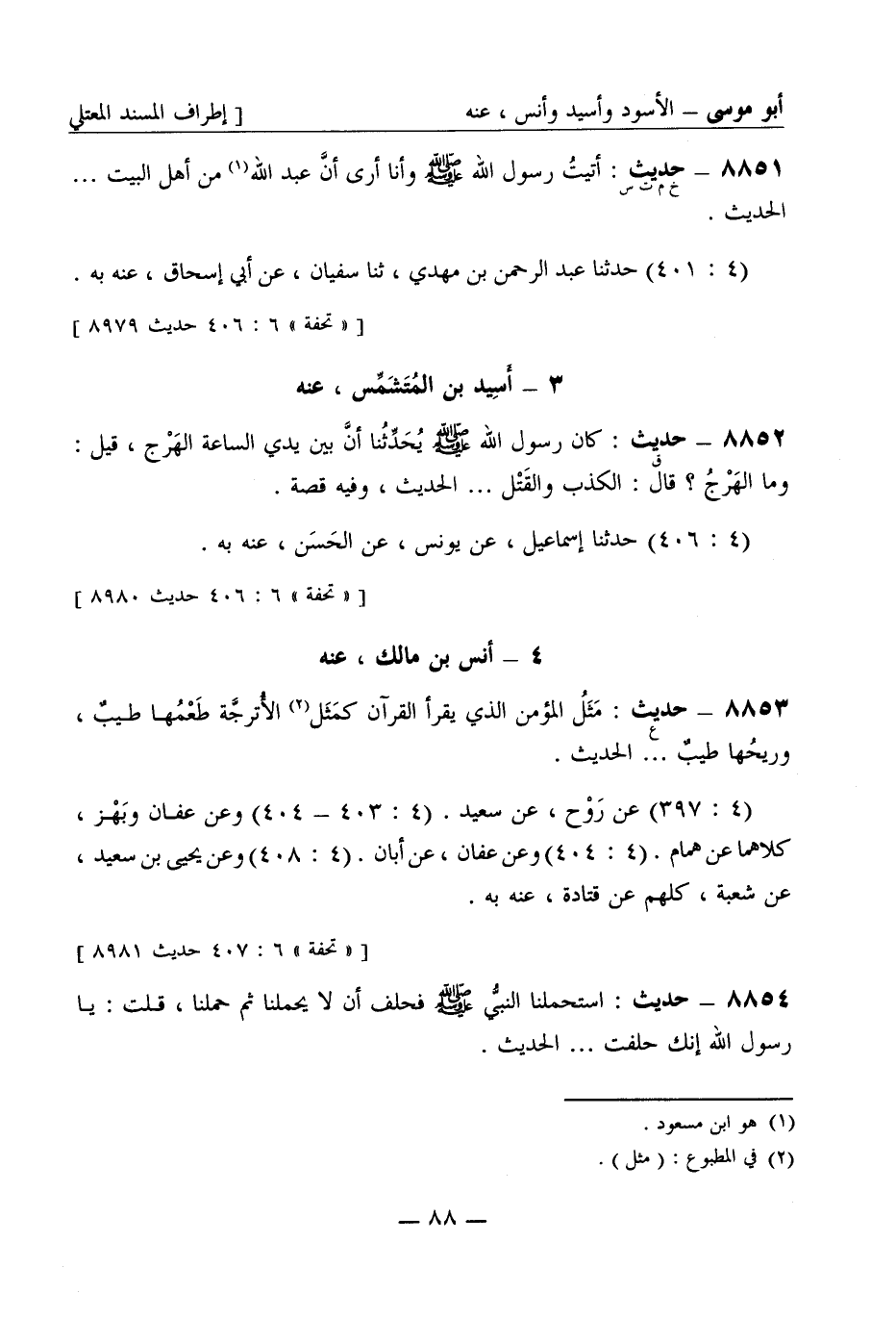8854 - حديث: استحملنا النبيُّ صَلَّى اللَّهُ عَلَيْهِ وَسَلَّمَ فحَلَف أن لا يحملنا ثم حملنا قُلت: يا رسول الله إنك حلفت ... الحديث -[89]- (3: 250) حَدَّثَنا عفان ثنا حمّاد عن حُمَيد سَمِعتُ أنساً: أنَّ أبا موسى استحمله فذَكَره وتَقَدَّم في ترجمة حُمَيد عن أنس من رواية يحيى القطان عن حُمَيد عن أنس أنَّ أبا موسى استحمله ... فذَكَره من مسند أنس (ح455)