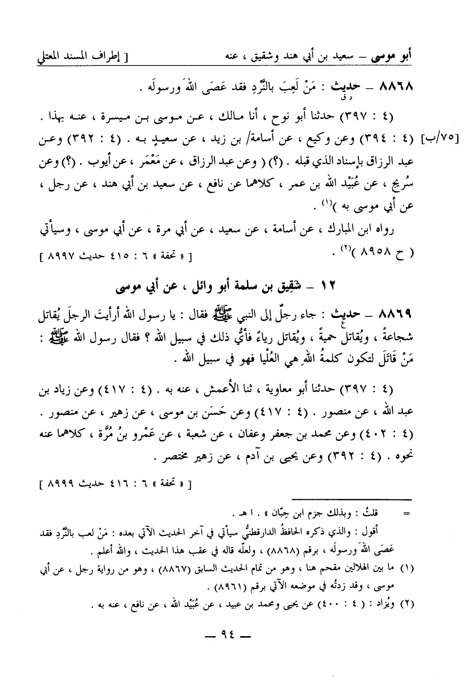 8868 -[د ق] حديث: من لَعِبَ بالنَّرْد فقد عَصَى الله ورسوله (4: 397) حَدَّثَنا أبو نوح أنا مالك عن موسى بن مَيْسَرة عنه بهذا (4: 394) وعن وكيع عن أسامة بن زيد عن سعيدٍ به (4: 392) وعن عبد الرزاق بإسناد الذي قبله (؟) (وعن عبد الرزاق عن مَعْمَر عن أيوب (؟) وعن سُرَيج عن عُبَيد الله بن عمر كلاهما عن نافع عن سعيد بن أبي هند عن رجل عن أبي موسى به) رواه ابن المبارك عن أسامة عن سعيد عن أبي مرة عن أبي موسى وسيأتي (ح8958)