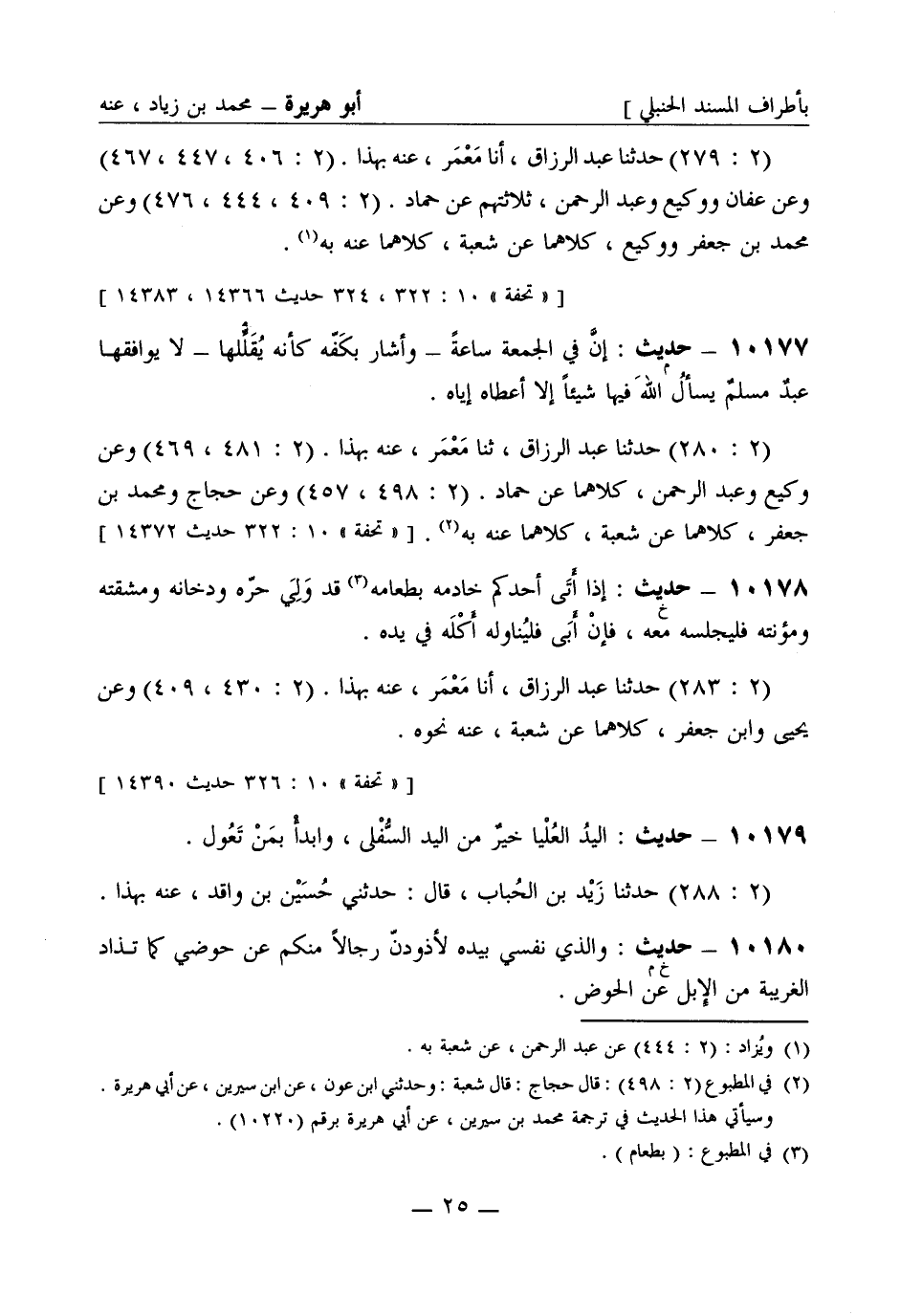 10177 -[م] حديث إن في الجمعة ساعة وأشار بكفه كأنه يقللها لا يوافقها عبد مسلم يسأل الله فيها شيئا إلا أعطاه إياه (2: 280) حدثنا عبد الرزاق ثنا معمر عنه بهذا (2: 481 , 469) وعن وكيع وعبد الرحمن كلاهما عن حماد (2: 498 , 457) وعن حجاج ومحمد بن جعفر كلاهما عن شعبة كلاهما عنه به