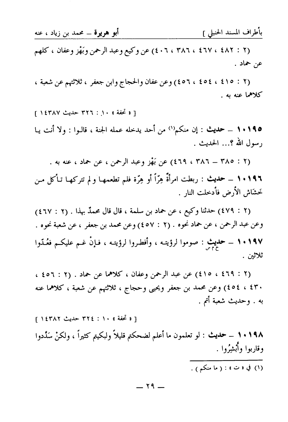 10197 -[خ م س] حديث صوموا لرؤيته وأفطروا لرؤيته فإن غم عليكم فعدوا ثلاثين (2: 469 , 415) عن عبد الرحمن وعفان كلاهما عن حماد (2: 456 , 430 , 454) وعن محمد بن جعفر ويحيى وحجاج ثلاثتهم عن شعبة كلاهما عنه به وحديث شعبة أتم