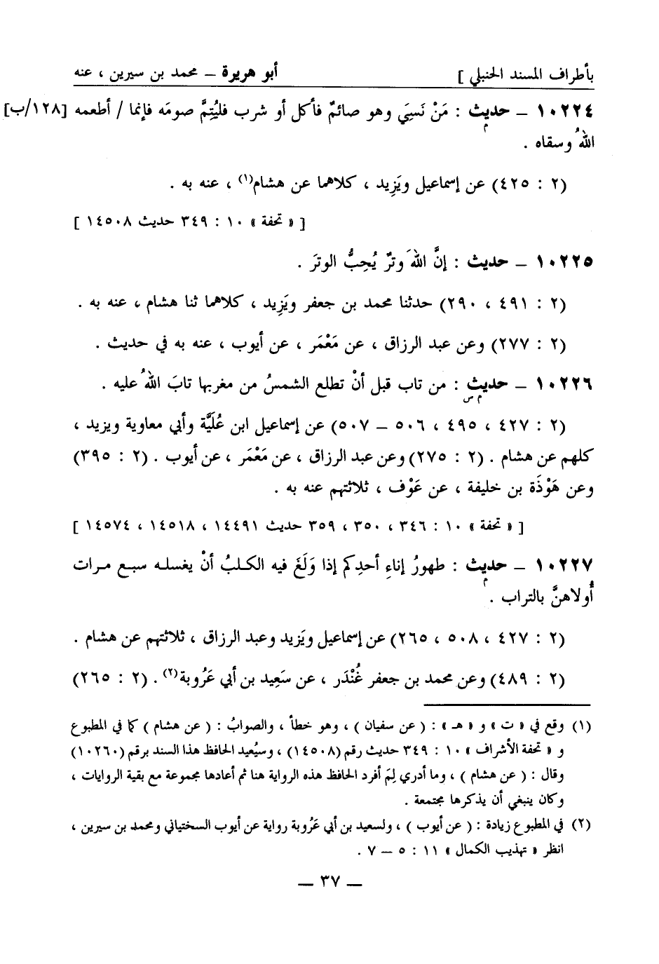 10225 - حديث إن الله وتر يحب الوتر (2: 491 , 290) حدثنا محمد بن جعفر ويزيد كلاهما ثنا هشام عنه به (2: 277) وعن عبد الرزاق عن معمر عن أيوب عنه به في حديث