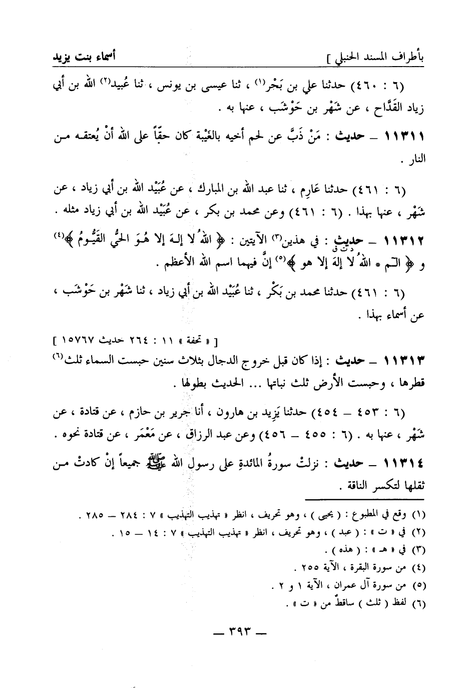 11312 -[د ت ق] حديث في هذين الآيتين الله لا إله إلا هو الحي القيوم والم الله لا إله إلا هو إن فيهما اسم الله العظيم (6: 461) حدثنا محمد بن بكر ثنا عبيد الله بن أبي زياد ثنا شهر بن حوشب عن أسماء بهذا