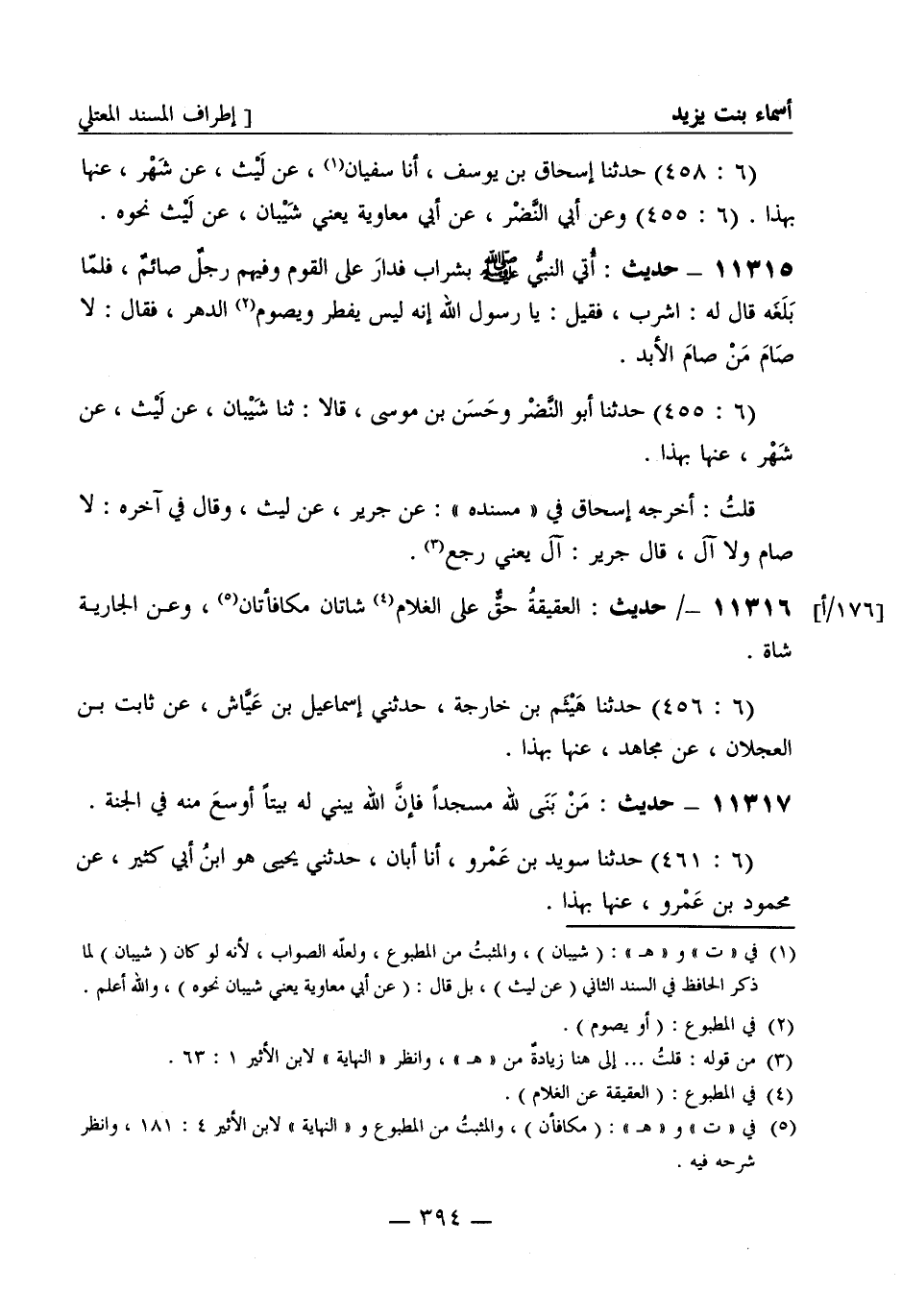 11315 - حديث أتي النبي صَلَّى اللَّهُ عَلَيْهِ وَسَلَّمَ بشراب فدار على القوم وفيهم رجل صائم فلما بلغه قال له اشرب فقيل يا رسول الله إنه ليس يفطر ويصوم الدهر فقال لا صام من صام الأبد (6: 455) حدثنا أبو النضر وحسن بن موسى قالا ثنا شيبان عن ليث عن شهر عنها بهذا قلت أخرجه إسحاق في مسنده عن جرير عن ليث وقال في آخره لا صام ولا آل قال جرير آل يعني رجع