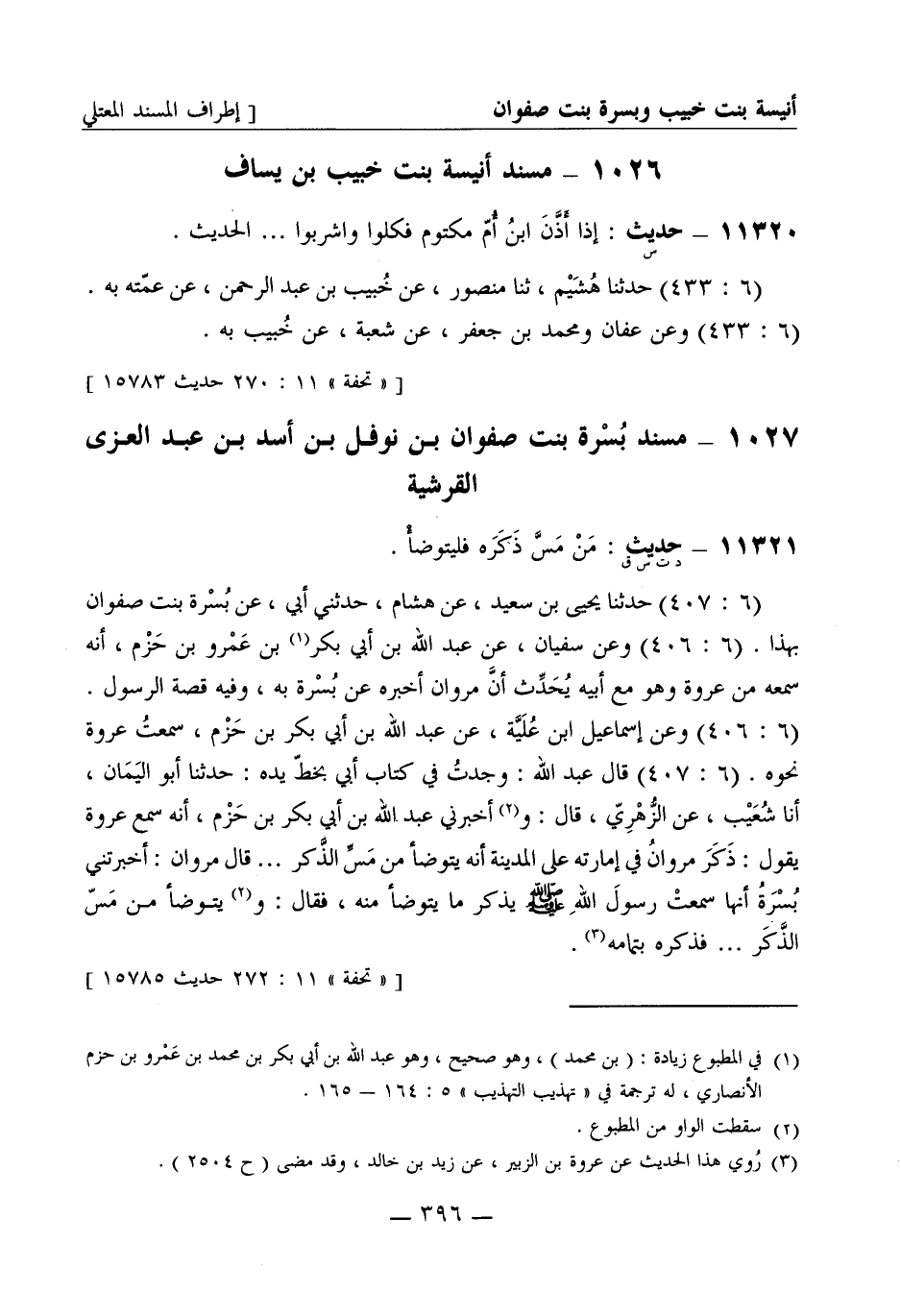 11321 -[د ت س ق] حديث من مس ذكره فليتوضأ (6: 407) حدثنا يحيى بن سعيد عن هشام حدثني أبي عن بسرة بنت صفوان بهذا (6: 406) وعن سفيان عن عبد الله بن أبي بكر بن عمرو بن حزم أنه سمعه من عروة وهو مع أبيه يحدث أن مروان أخبره عن بسرة به وفيه قصة الرسول (6: 406) وعن إسماعيل ابن علية عن عبد الله بن أبي بكر بن حزم سمعت عروة نحوه (6: 407) قال عبد الله وجدت في كتاب أبي بخط يده حدثنا أبو اليمان أنا شعيب عن الزهري قال وأخبرني عبد الله بن أبي بكر بن حزم أنه سمع عروة يقول ذكر مروان في إمارته على المدينة أنه يتوضأ من مس الذكر قال مروان أخبرتني بسرة أنها سمعت رسول الله صَلَّى اللَّهُ عَلَيْهِ وَسَلَّمَ يذكر ما يتوضأ منه فقال ويتوضأ من مس الذكر ... . فذكره بتمامه