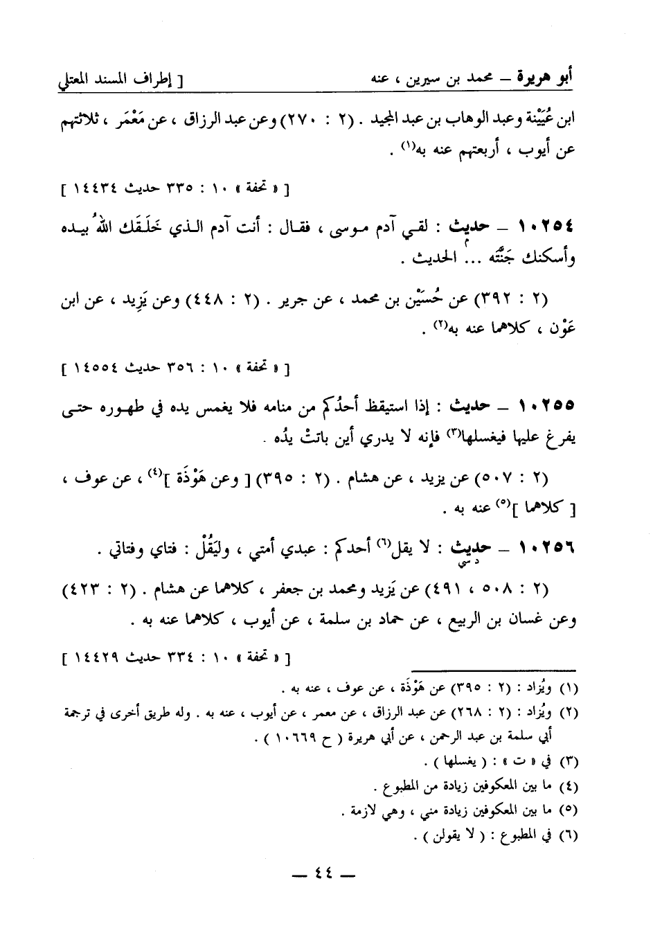 10255 - حديث إذا استيقظ أحدكم من منامه فلا يغمس يده في طهوره حتى يفرغ عليها فيغسلها فإنه لا يدري أين باتت يده (2: 507) عن يزيد عن هشام (2: 395) [وعن هوذة] عن عوف [كلاهما] عنه به
