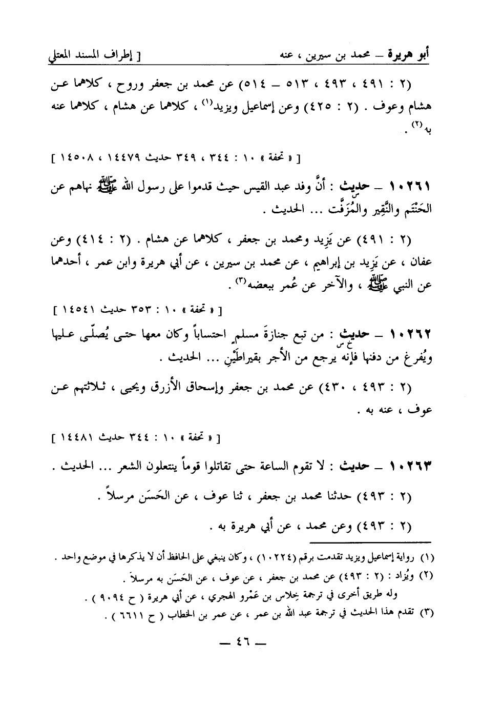 10261 -[س] حديث أن وفد عبد القيس حيث قدموا على رسول الله صَلَّى اللَّهُ عَلَيْهِ وَسَلَّمَ نهاهم عن الحنتم والنقير والمزفت ... . الحديث (2: 491) عن يزيد ومحمد بن جعفر كلاهما عن هشام (2: 414) وعن عفان عن يزيد بن إبراهيم عن محمد بن سيرين عن أبي هريرة وابن عمر أحدهما عن النبي صَلَّى اللَّهُ عَلَيْهِ وَسَلَّمَ والآخر عن عمر ببعضه