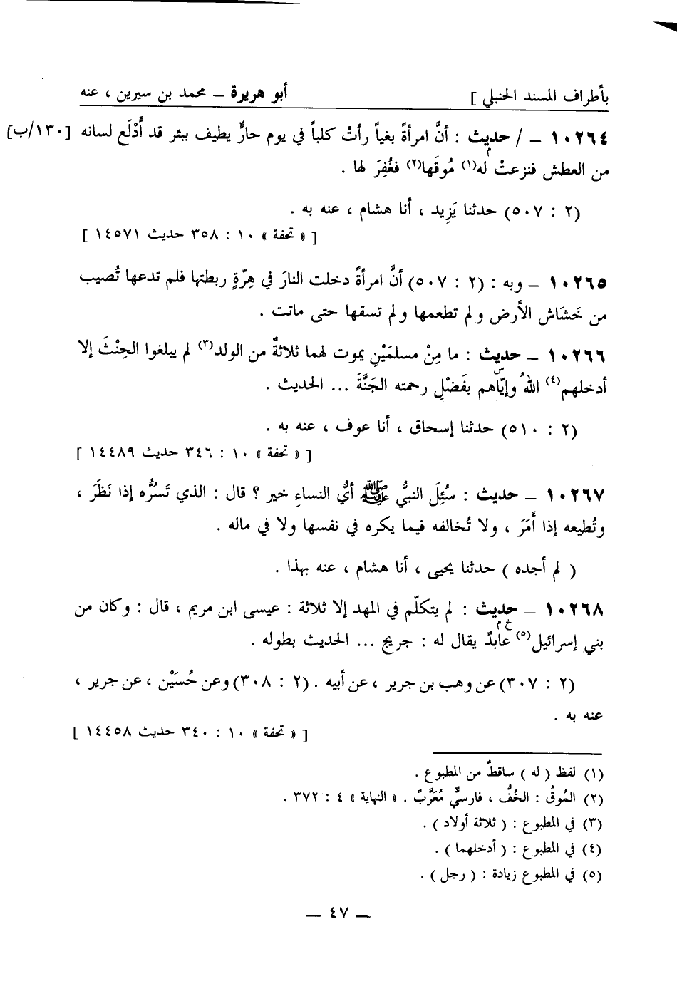 10268 -[خ م] حديث لم يتكلم في المهد إلا ثلاثة عيسى ابن مريم قال وكان من بني إسرائيل عابد يقال له جريج ... . الحديث بطوله (2: 307) عن وهب بن جرير عن أبيه (2: 308) وعن حسين عن جرير عنه به