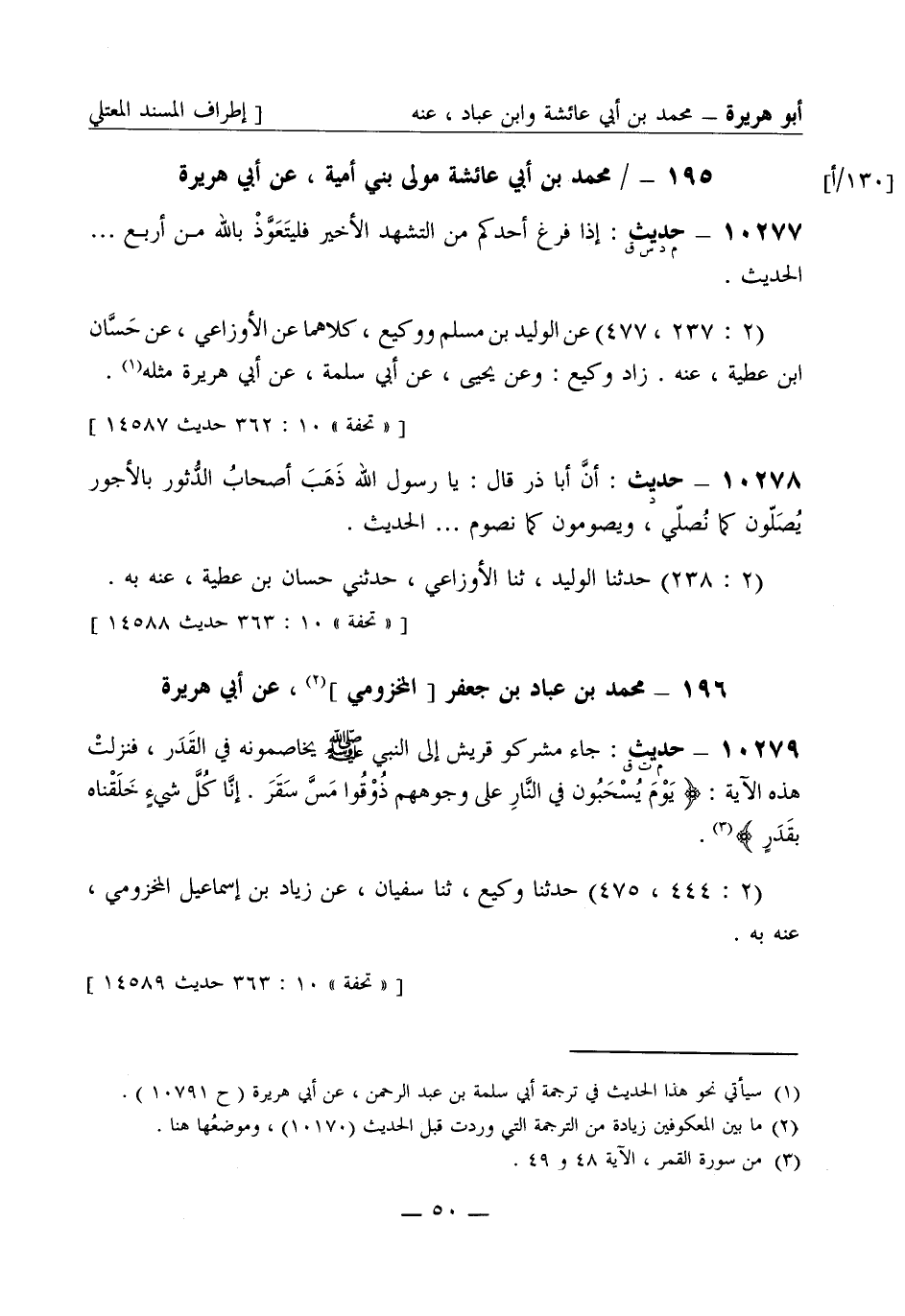 10277 -[م د س ق] حديث إذا فرغ أحدكم من التشهد الأخير فليتعوذ بالله من أربع ... . الحديث (2: 237 , 477) عن الوليد بن مسلم ووكيع كلاهما عن الأوزاعي عن حسان بن عطية عنه زاد وكيع وعن يحيى عن أبي سلمة عن أبي هريرة مثله