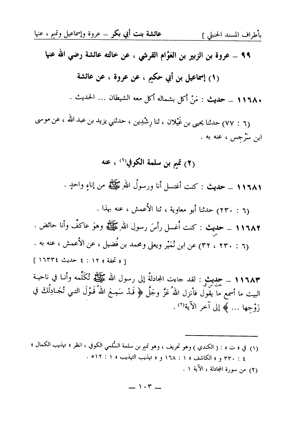11683 -[خت س ق] حديث لقد جاءت المجادلة إلى رسول الله صَلَّى اللَّهُ عَلَيْهِ وَسَلَّمَ تكلمه وأنا في ناحية البيت ما أسمع ما يقول فأنزل الله عز وجل قد سمع الله قول التي تجادلك في زوجها ... إلى آخر الآية -[104]- (6: 46) حدثنا أبو معاوية عن الأعمش عنه به
