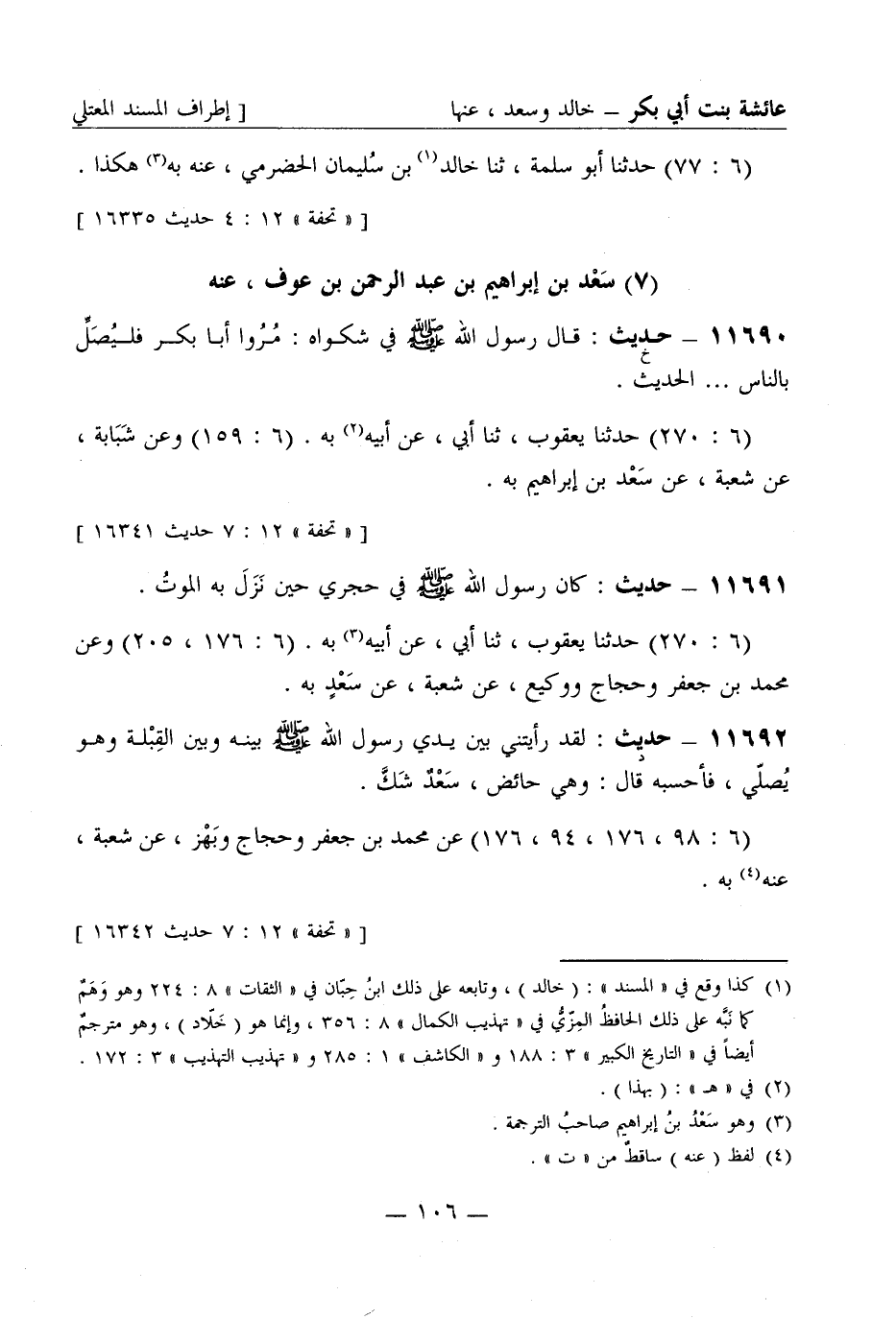11691 - حديث كان رسول الله صَلَّى اللَّهُ عَلَيْهِ وَسَلَّمَ في حجري حين نزل به الموت (6: 270) حدثنا يعقوب، ثنا أبي، عن أبيه به (6: 176، 205) وعن محمد بن جعفر وحجاج ووكيع عن شعبة عن سعد به