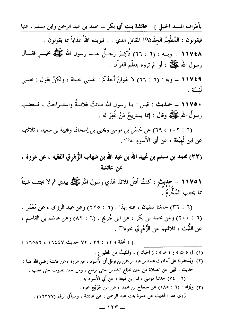 11750 - حديث قيل يا رسول الله ماتت فلانة واستراحت فغضب رسول الله صَلَّى اللَّهُ عَلَيْهِ وَسَلَّمَ وقال إنما يستريح من غفر له (6: 102، 69) عن حسن بن موسى ويحيى بن إسحاق وقتيبة بن سعيد، ثلاثتهم عن ابن لهيعة، عن أبي الأسود به. (33) محمد بن مسلم بن عبيد الله بن عبد الله بن شهاب الزهري الفقيه عن عروة عن عائشة