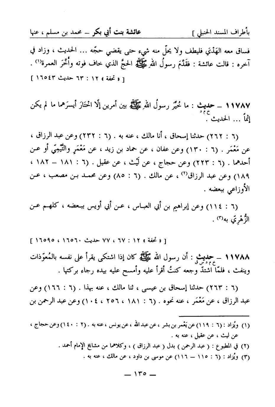 11787 - (خ م د) حديث: ما خير رسول الله صَلَّى اللَّهُ عَلَيْهِ وَسَلَّمَ بين أمرين إلا اختار أيسرهما ما لم يكن إثما ... . الحديث (6: 262) حدثنا إسحاق أنا مالك عنه به (6: 232) وعن عبد الرزاق عن معمر (6: 130) وعن عفان عن حماد بن زيد عن معمر والتيمي أو عن أحدهما (6: 223) وعن حجاج عن ليث عن عقيل (6: 181 - 182، 189) وعن عبد الرزاق عن مالك (6: 85) وعن محمد بن مصعب عن الأوزاعي ببعضه (6: 114) وعن إبراهيم بن أبي العباس عن أبي أويس ببعضه كلهم عن الزهري به