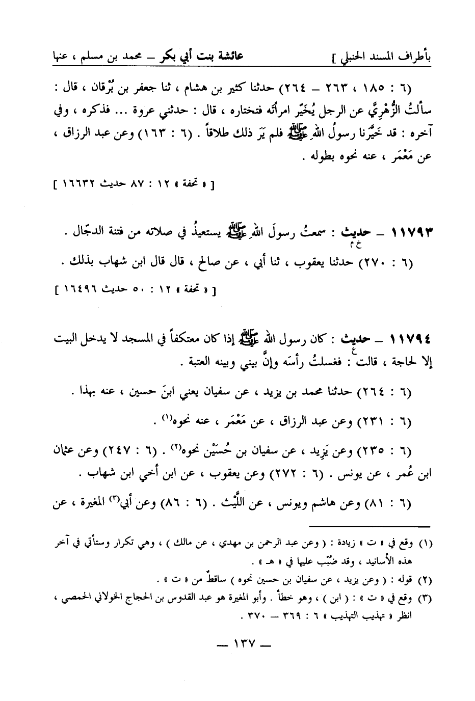 11794 -[ع] حديث كان رسول الله صَلَّى اللَّهُ عَلَيْهِ وَسَلَّمَ إذا كان معتكفا في المسجد لا يدخل البيت إلا لحاجة قالت فغسلت رأسه وإن بيني وبينه العتبة (6: 264) حدثنا محمد بن يزيد، عن سفيان يعني ابن حسين عنه بهذا (6: 231) وعن عبد الرزاق عن معمر عنه نحوه (6: 235) وعن يزيد عن سفيان بن حسين نحوه (6: 247) وعن عثمان بن عمر عن يونس (6: 272) وعن يعقوب عن ابن أخي ابن شهاب (6: 81) وعن هاشم ويونس عن الليث (6: 86) وعن أبي المغيرة عن -[138]- الأوزاعي (6: 181) وعن عبد الرحمن بن مهدي عن مالك كلهم عنه به نحوه
