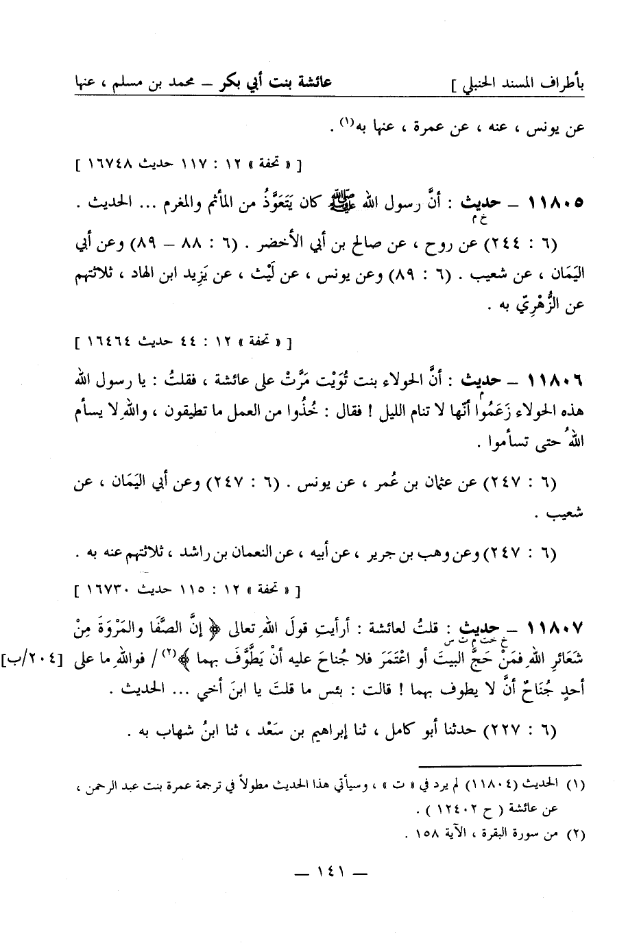 11807 - (خ خت م ت س) حديث قلت لعائشة أرأيت قول الله تعالى إن الصفا والمروة من شعائر الله فمن حج البيت أو اعتمر فلا جناح عليه أن يطوف بهما فوالله ما على أحد جناح أن لا يطوف بهما قالت بئس ما قلت يا ابن أخي ... الحديث (6: 227) حدثنا أبو كامل ثنا إبراهيم بن سعد ثنا ابن شهاب به -[142]- (6: 144) وعن سليمان بن داود الهاشمي عن إبراهيم به (6: 162) وعن عبد الرزاق عن معمر عنه نحوه