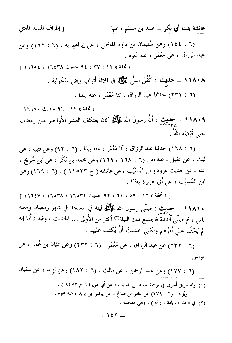 11809 -[خ م د ت س] حديث أن رسول الله صَلَّى اللَّهُ عَلَيْهِ وَسَلَّمَ كان يعتكف العشر الأواخر من رمضان حتى قبضه الله (6: 168) حدثنا عبد الرزاق أنا معمر عنه بهذا (6: 92) وعن قتيبة عن ليث عن عقيل عنه به (6: 168، 169) وعن محمد بن بكر عن ابن جريج عنه عن حديث عروة وابن المسيب عن عائشة (ح 11523) (6: 169) وعن ابن المسيب عن أبي هريرة به