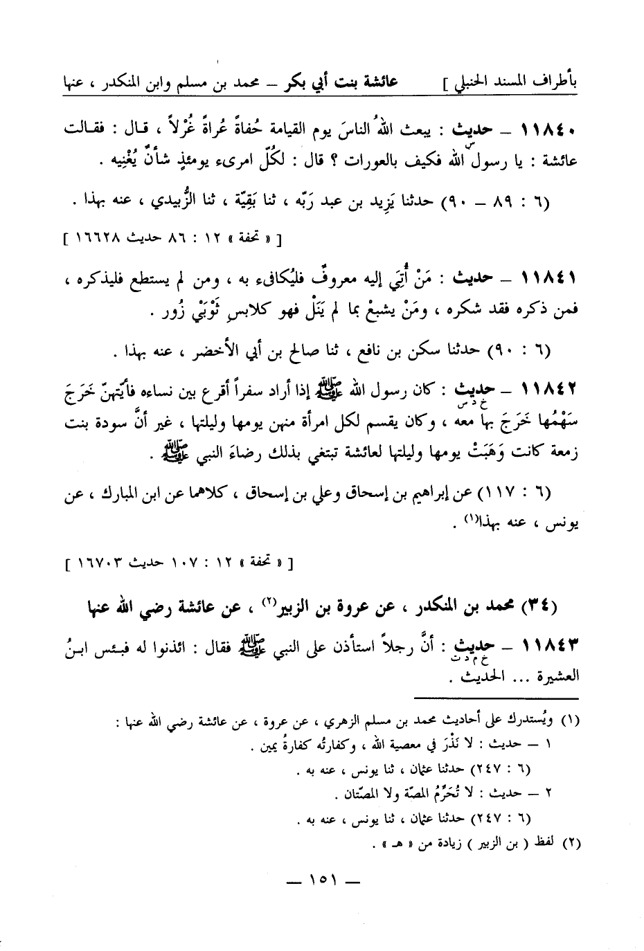 [تحفة 12: 107 حديث 16703] (34) محمد بن المنكدر عن عروة بن الزبير عن عائشة رضي الله عنها