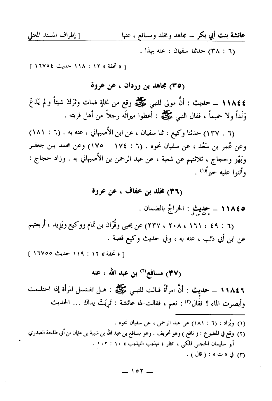 11844 - حديث أن مولى للنبي صَلَّى اللَّهُ عَلَيْهِ وَسَلَّمَ وقع من نخلة فمات وترك شيئا ولم يدع ولدا ولا حميما فقال النبي صَلَّى اللَّهُ عَلَيْهِ وَسَلَّمَ أعطوا ميراثه رجلا من أهل قريته (6: 137) حدثنا وكيع ثنا سفيان عن ابن الأصبهاني عنه به (6: 181) وعن عمر بن سعد عن سفيان نحوه (6: 174 - 175) وعن محمد بن جعفر وبهز وحجاج ثلاثتهم عن شعبة عن عبد الرحمن بن الأصبهاني به وزاد حجاج وأثنوا عليه خيرا (36) مخلد بن خفاف عن عروة