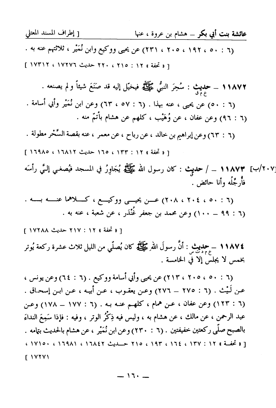 11874 -[خ م د ت س] حديث أن رسول الله صَلَّى اللَّهُ عَلَيْهِ وَسَلَّمَ كان يصلي من الليل ثلاث عشرة ركعة يوتر بخمس لا يجلس إلا في الخامسة (6: 50، 205، 213) عن يحيى وأبي أسامة ووكيع (6: 64) وعن يونس عن ليث (6: 275 - 276) وعن يعقوب عن أبيه عن ابن إسحاق (6: 123) وعن عفان عن همام كلهم عنه به (6: 177 - 178) وعن عبد الرحمن عن مالك عن هشام به وليس فيه ذكر الوتر وفيه فإذا سمع النداء بالصبح صلى ركعتين خفيفتين (6: 230) وعن ابن نمير عن هشام بالحديث بتمامه