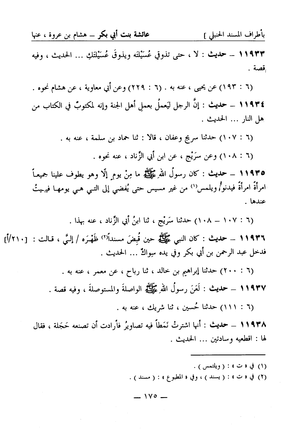 11935 - حديث كان رسول الله صَلَّى اللَّهُ عَلَيْهِ وَسَلَّمَ ما من يوم إلا وهو يطوف علينا جميعا امرأة امرأة فيدنوا ويلمس من غير مسيس حتى يفضي إلى التي هي يومها فيبيت عندها (6: 107 - 108) حدثنا سريج ثنا ابن أبي الزناد عنه بهذا