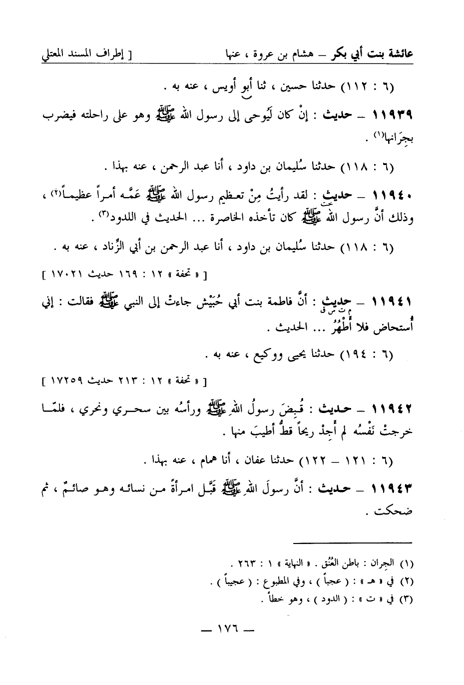 11942 - حديث قبض رسول الله صَلَّى اللَّهُ عَلَيْهِ وَسَلَّمَ ورأسه بين سحري ونحري فلما خرجت نفسه لم أجد ريحا قط أطيب منها (6: 121 - 122) حدثنا عفان أنا همام عنه بهذا