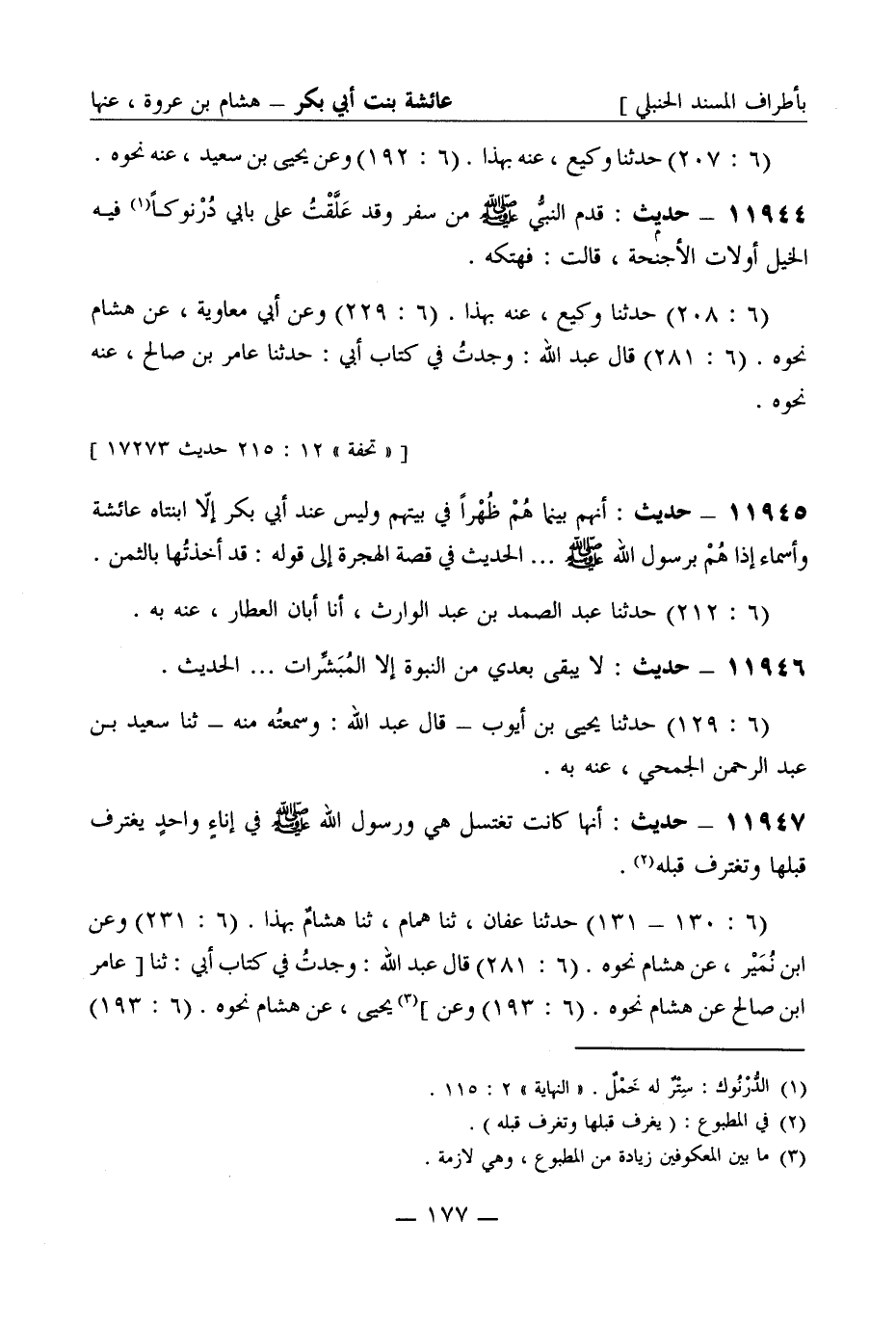 11944 -[م] حديث قدم النبي صَلَّى اللَّهُ عَلَيْهِ وَسَلَّمَ من سفر وقد علقت على بابي درنوكا فيه الخيل أولات الأجنحة، قالت فهتكه. (6: 208) حدثنا وكيع، عنه بهذا (6: 229) وعن أبي معاوية عن هشام نحوه (6: 281) قال عبد الله وجدت في كتاب أبي: حدثنا عامر بن صالح عنه نحوه.